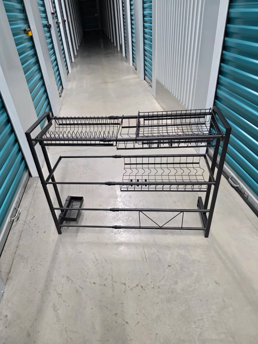 This black metal dish drying rack features two tiers for ample drying space. It includes a small basket for cutlery and a drip tray. This rack is designed to sit over your sink, helping to maximize kitchen counter space.