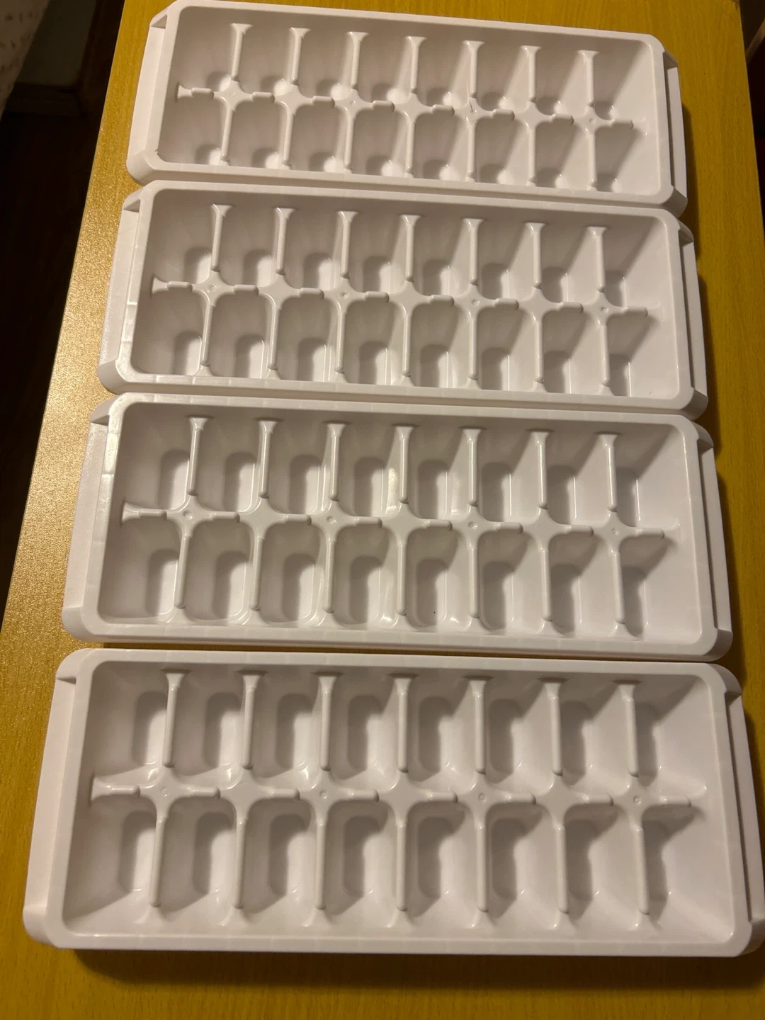 This is a set of four white plastic ice cube trays. Each tray holds 14 cubes, for a total of 56 cubes. They're made of durable plastic and stackable for easy storage. Great for keeping your drinks cool!