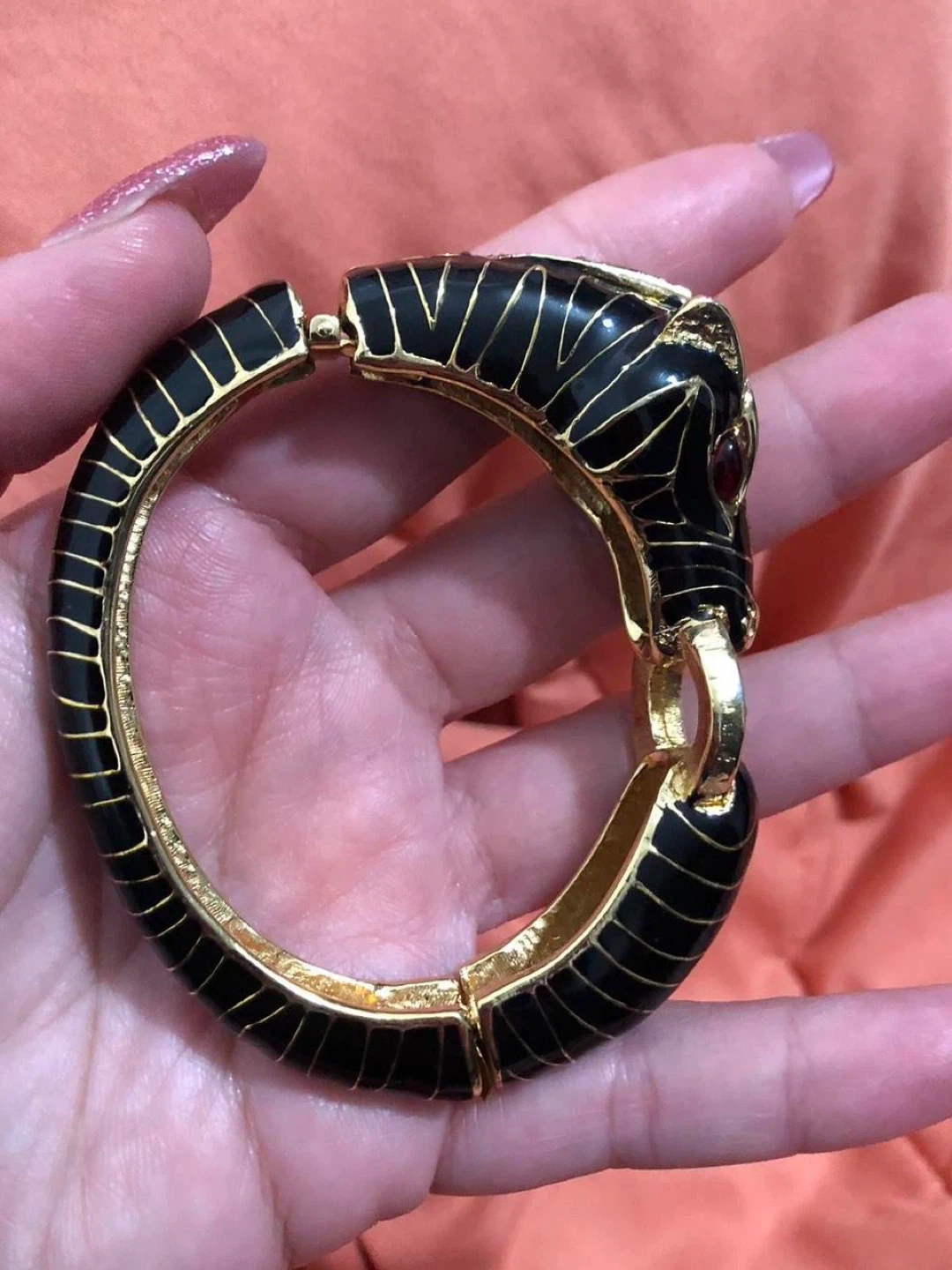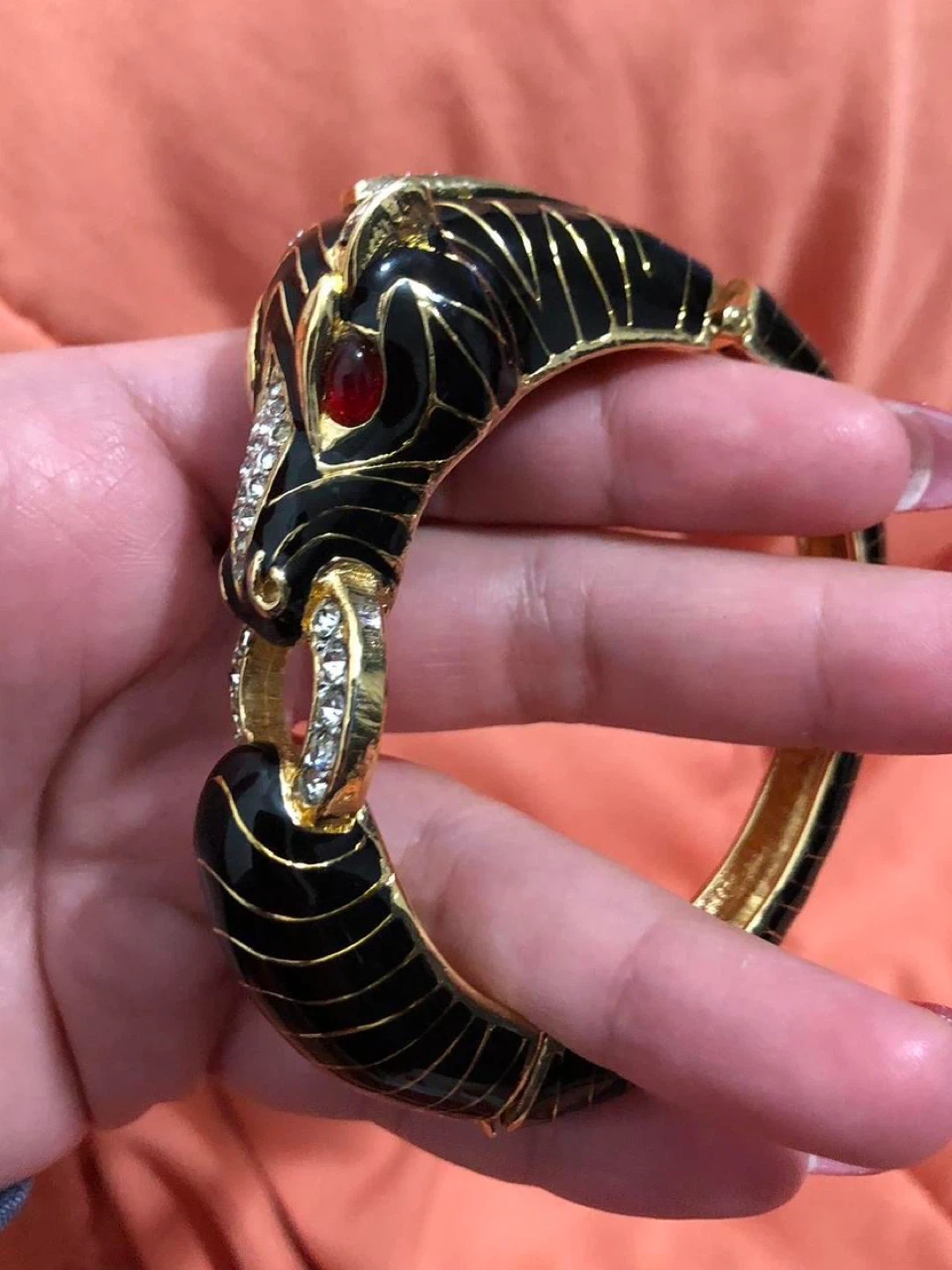 This striking bangle features a black panther head with red jeweled eyes and clear rhinestone accents. It's made of gold-tone metal with black enamel and gold-tone striping. The hinged design allows for easy wear. A bold statement piece for any jewelry collection!