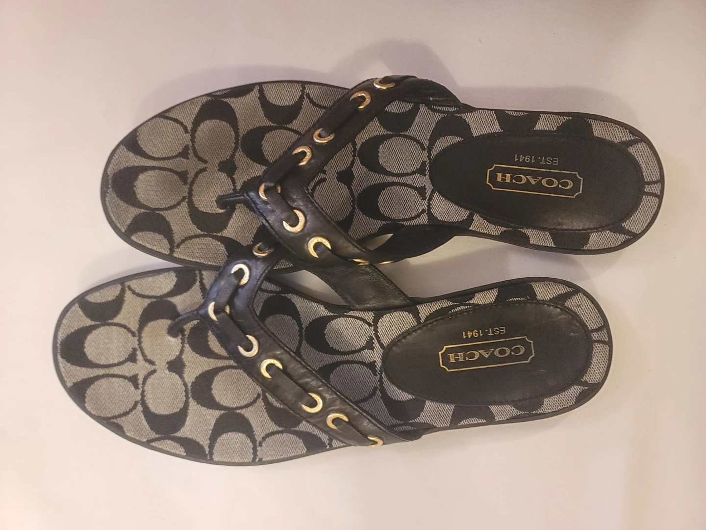 Classic Coach flip flops featuring the signature 'C' pattern. These sandals have black leather straps with gold-tone hardware accents. A stylish choice for casual wear.