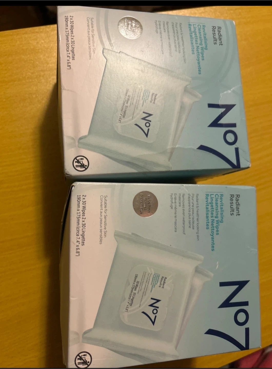 This is a value pack of No. 7 Radiant Results Revitalising Cleansing Wipes, containing two packs of 30 wipes each. They're suitable for sensitive skin and designed to remove even waterproof mascara. Each wipe measures approximately 190mm x 175mm (7.4" x 6.8").