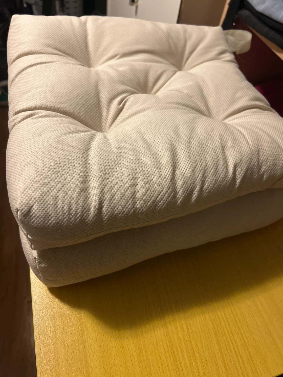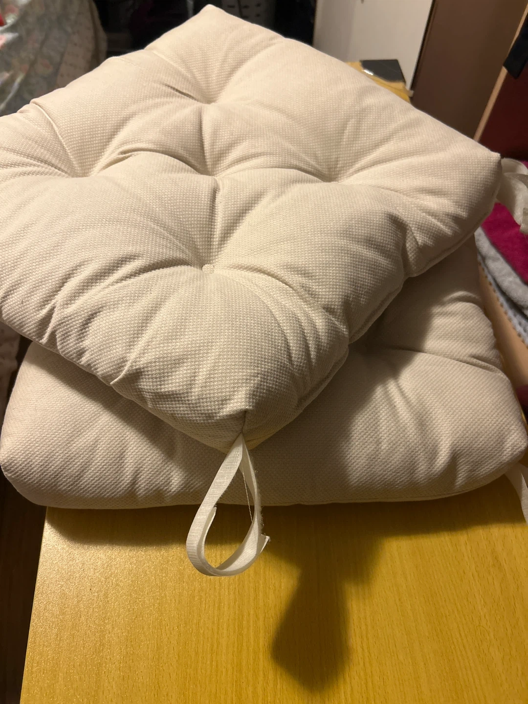 This is set of two (2) tufted square seat cushion. It's made of a durable fabric with a textured weave. Features tie straps for secure placement. Great for adding comfort to chairs!