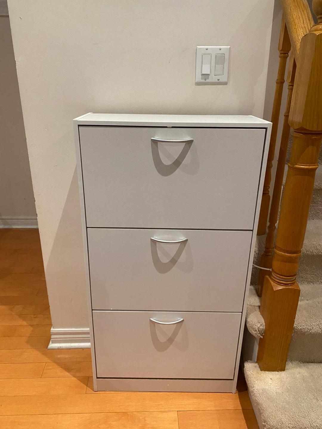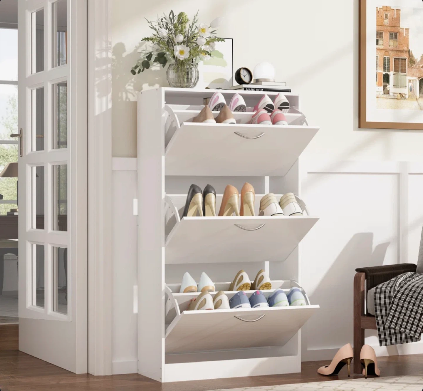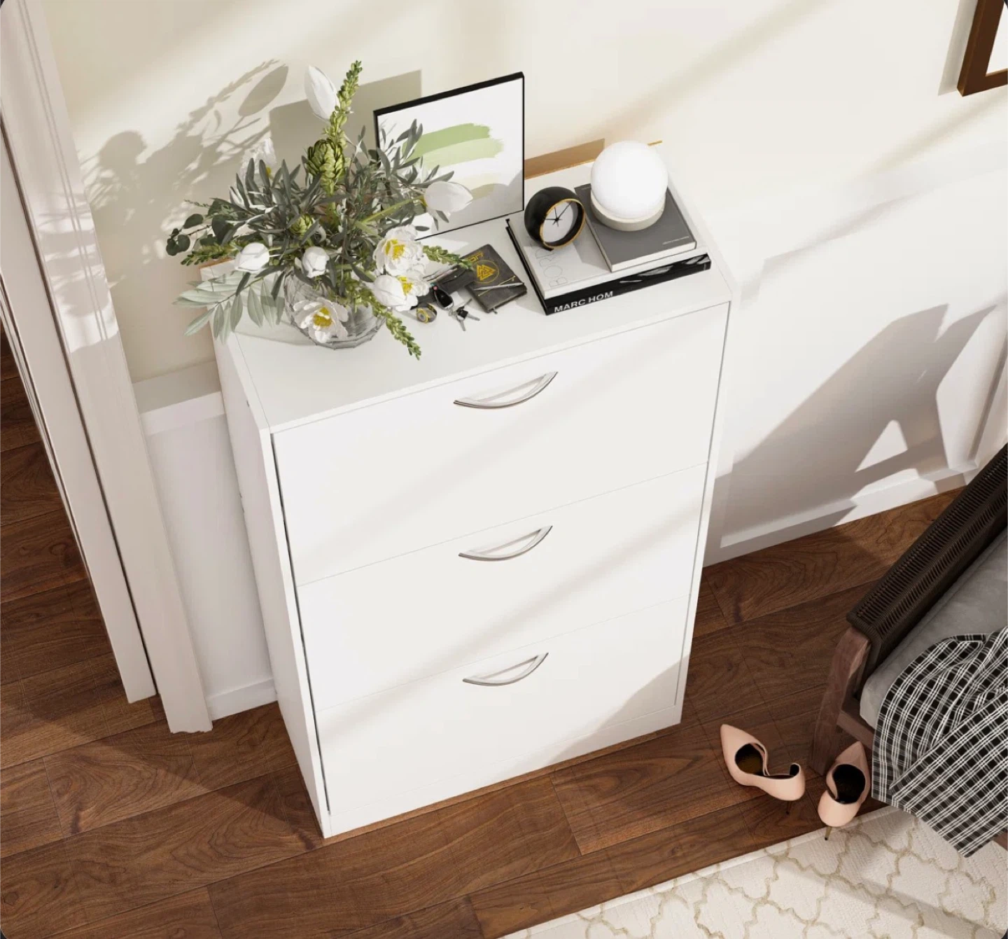This white shoe cabinet features three flip-down drawers for convenient storage. It's made of durable material and has a clean, modern design. It helps keep your entryway tidy and shoes organized!