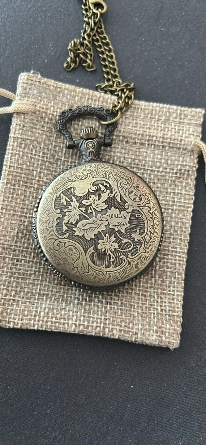 Bronze-tone pocket watch featuring a motorcycle design on the front and ornate scrollwork on the back. It includes a long chain and comes with a protective pouch. This timepiece is perfect for adding a unique touch to any outfit or for collectors.