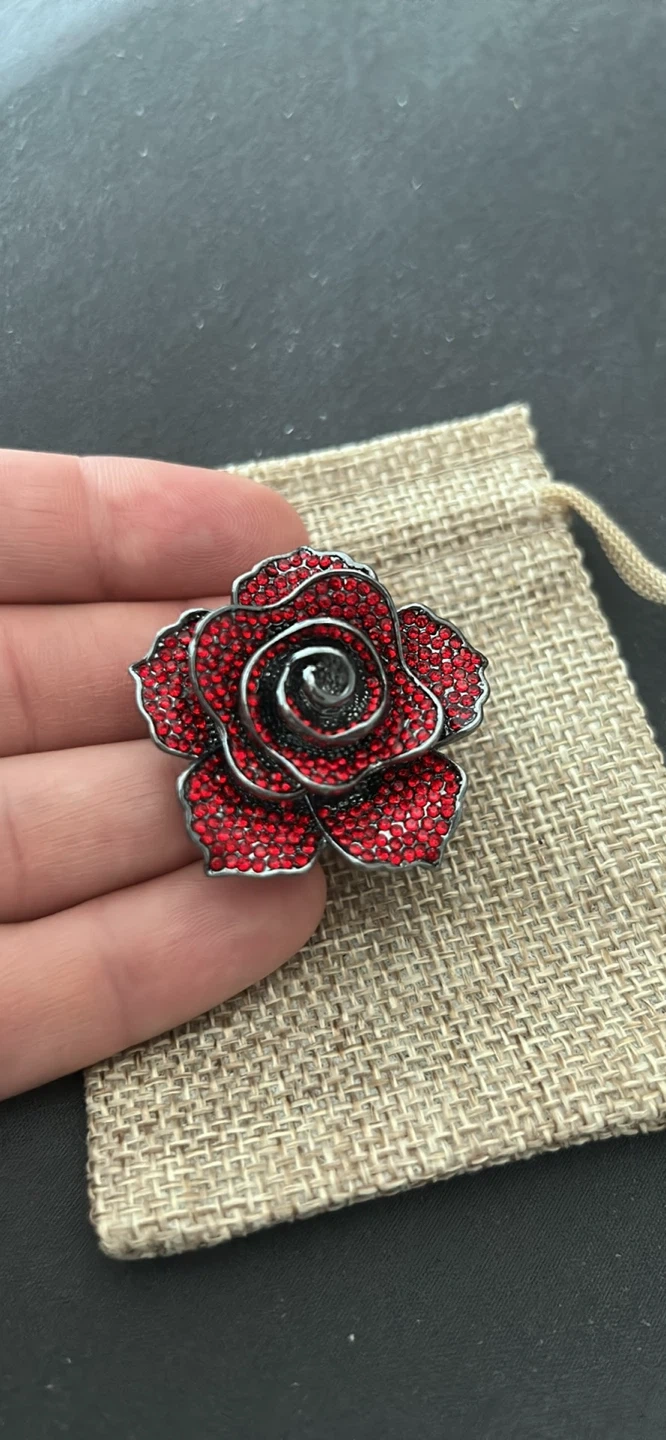 Sparkly red rose brooch, adorned with rhinestones. It features a classic rose design with a detailed metal setting. Comes with a small burlap pouch for storage.
