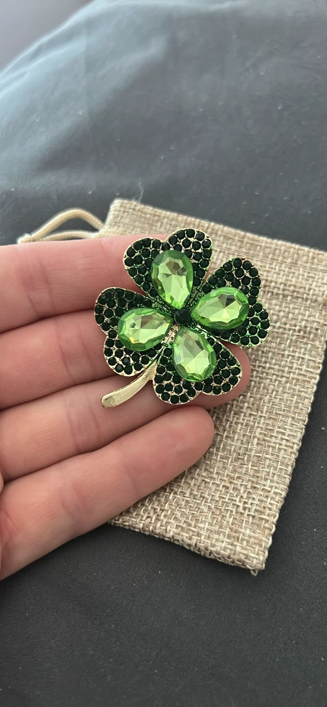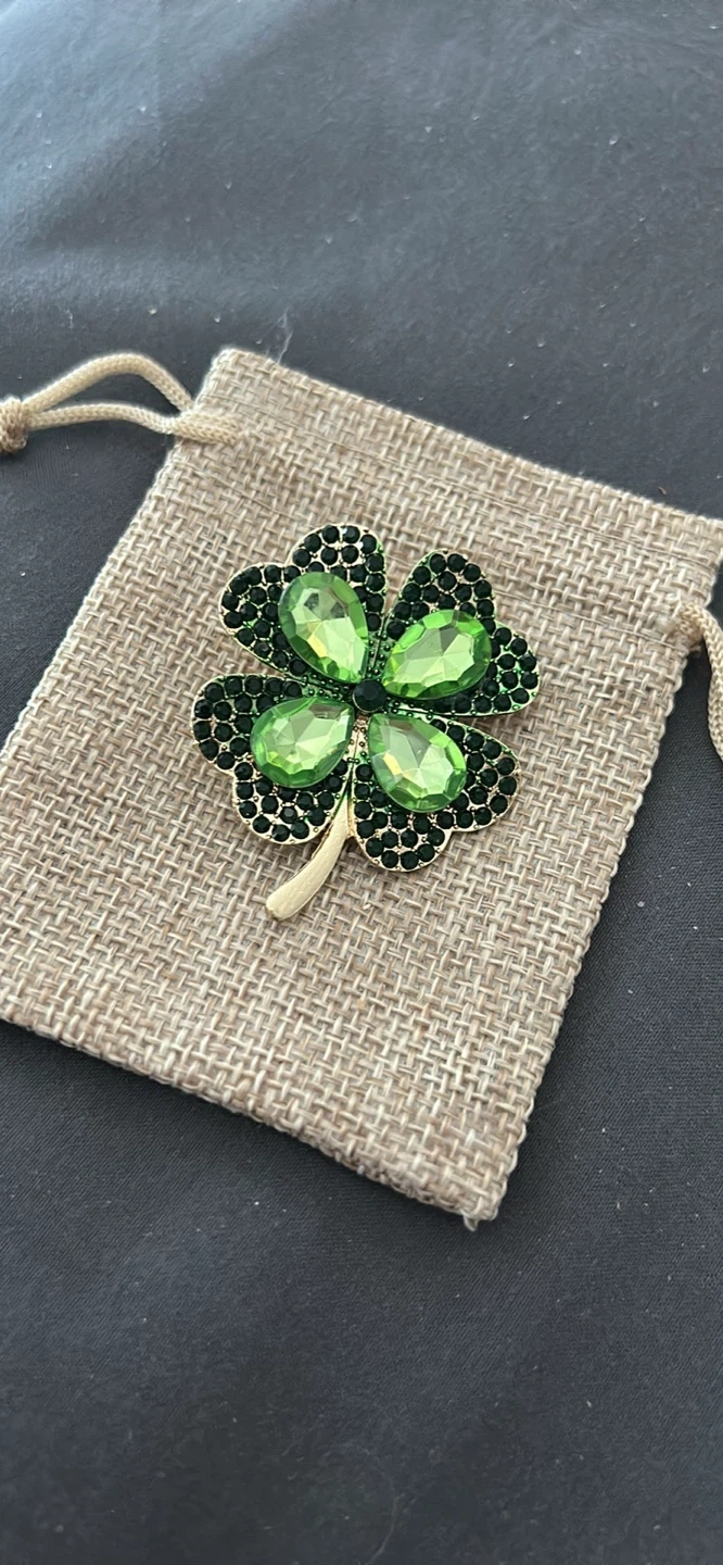 This charming brooch features a four-leaf clover design, embellished with sparkling green rhinestones. It's crafted with a gold-tone finish and includes a secure pin backing. Perfect for adding a touch of luck to any outfit!