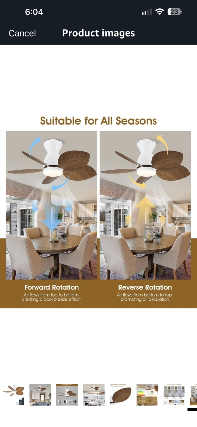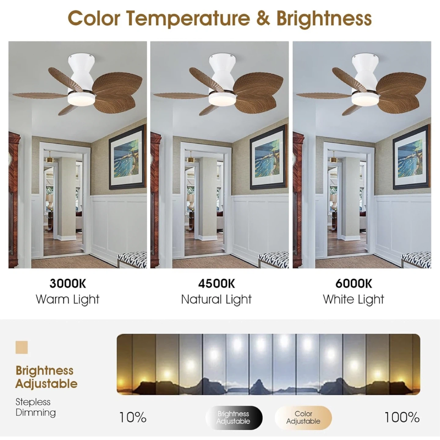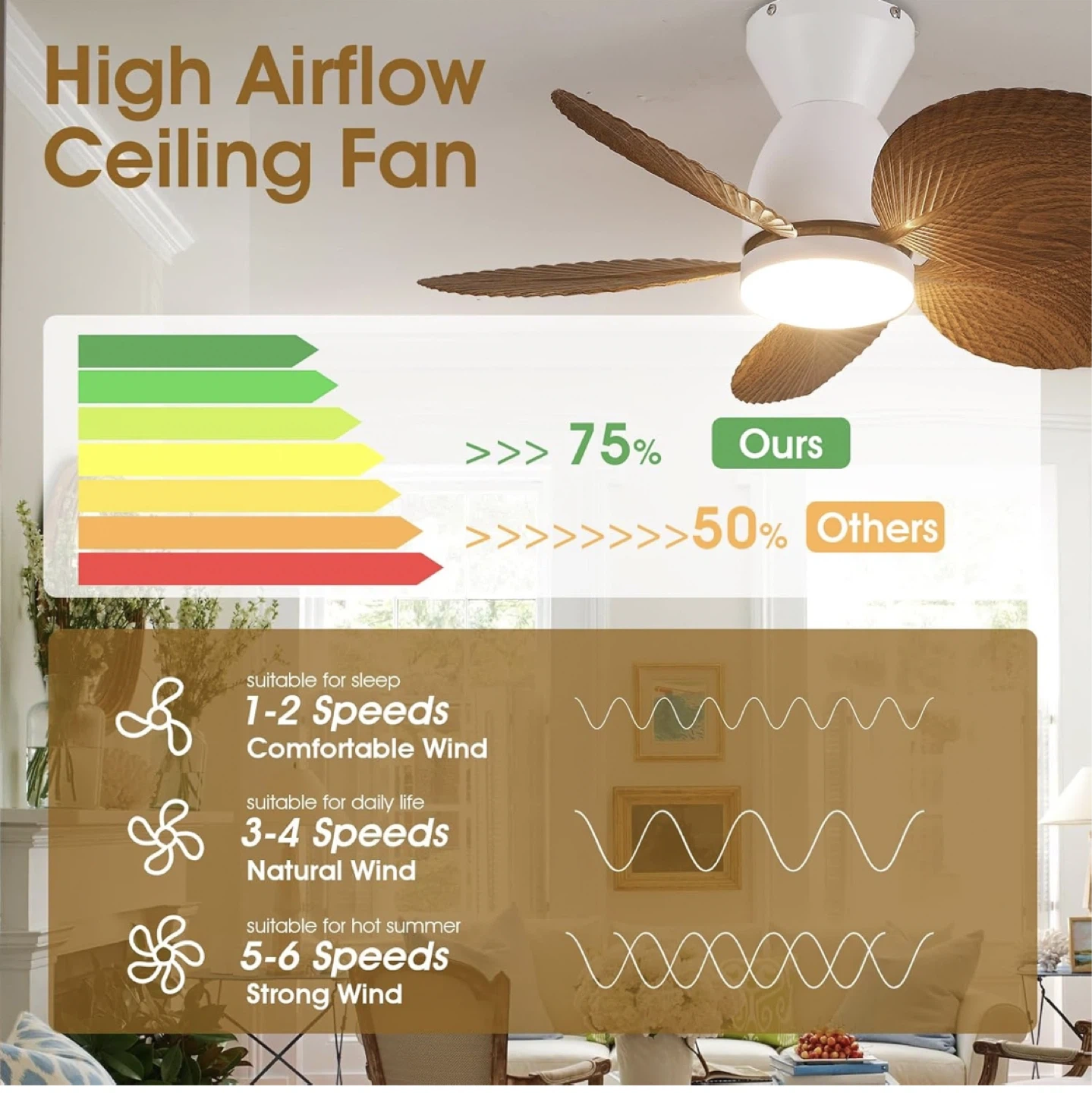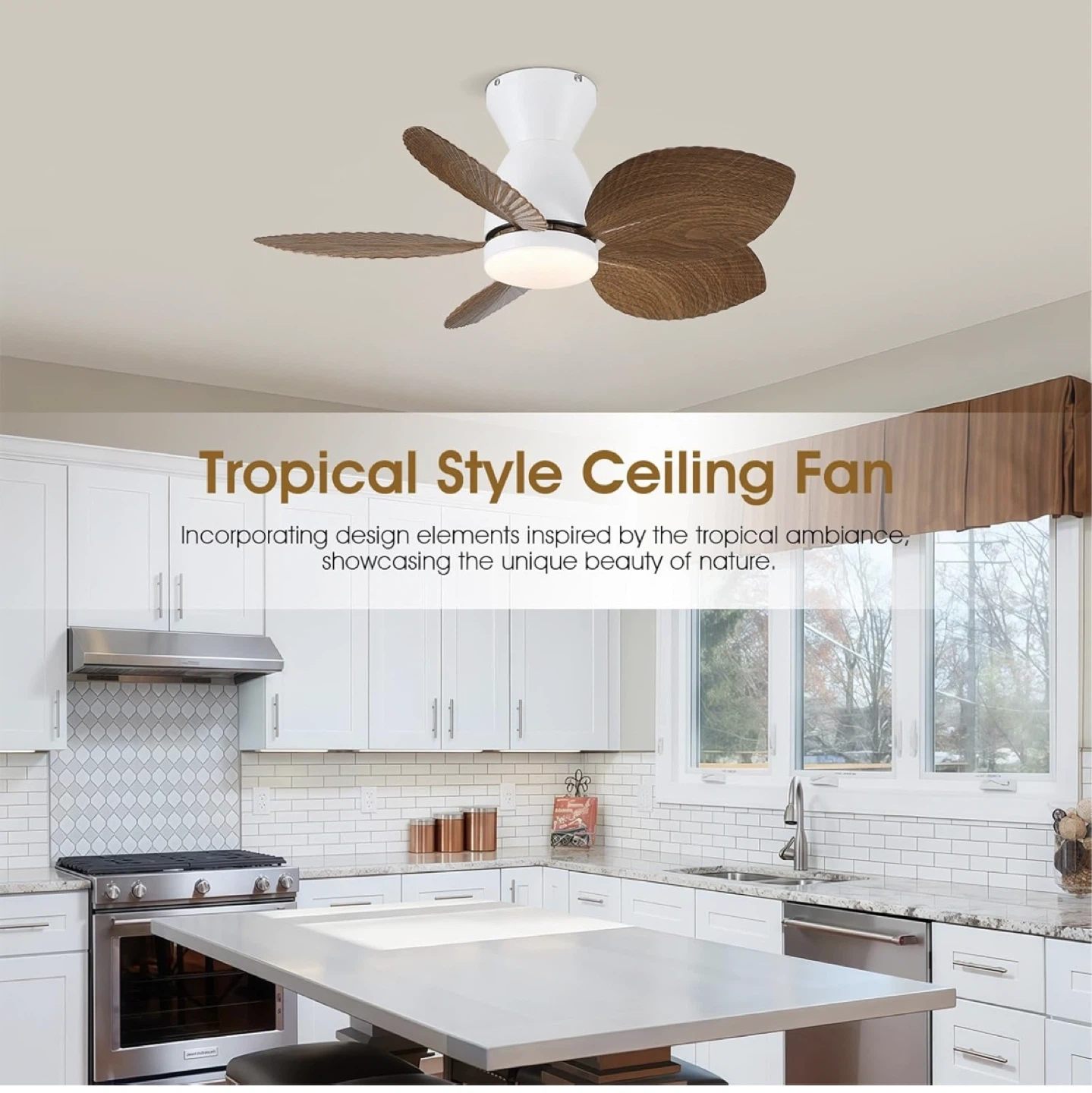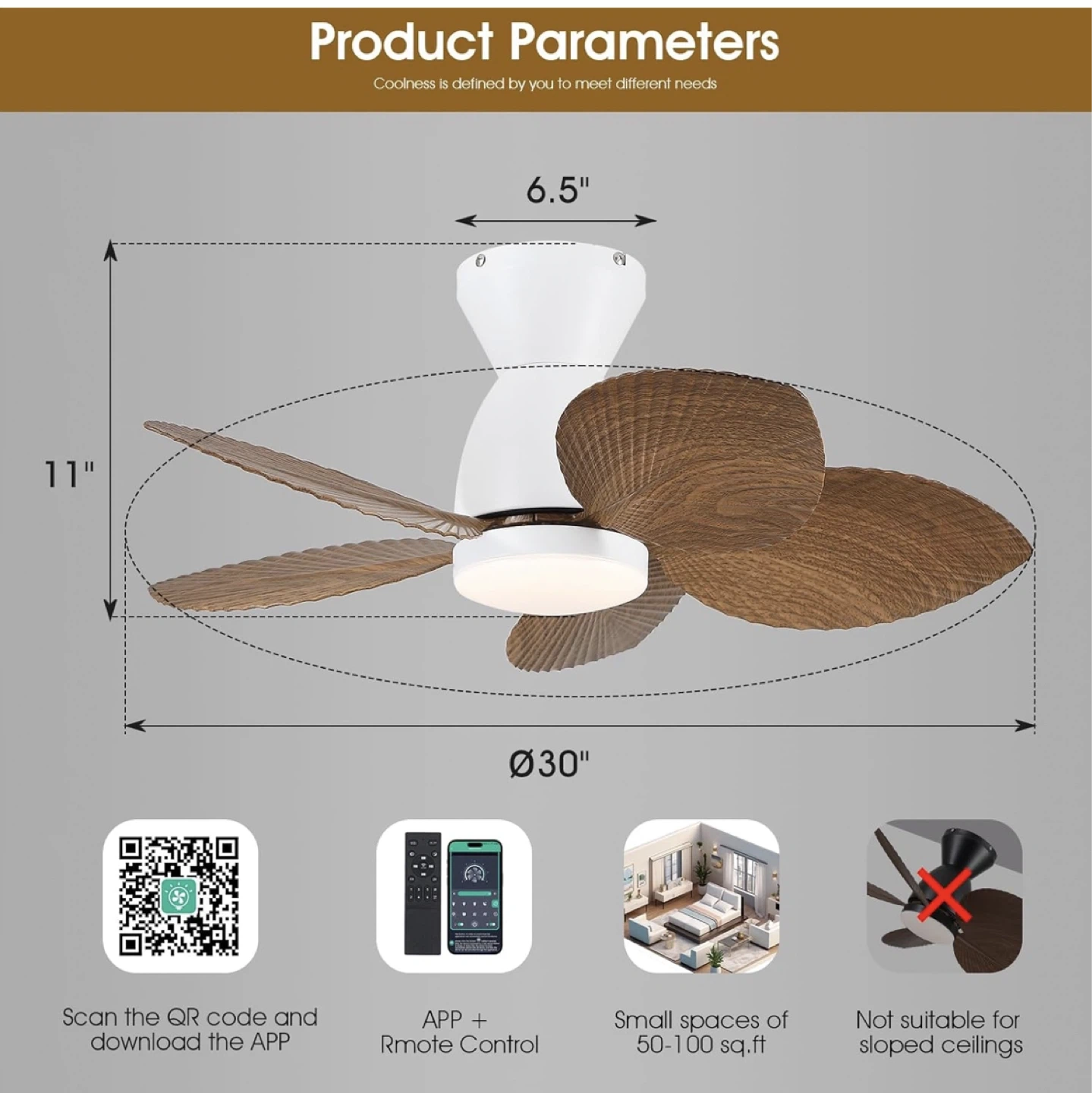 This tropical style ceiling fan features distinctive leaf-shaped ABS blades with a wood grain finish. It includes an LED light and comes with both a remote control and app control options. The fan has a diameter of 30 inches and a height of 11 inches, suitable for small spaces up to 100 sq. ft. It's not suitable for sloped ceilings.