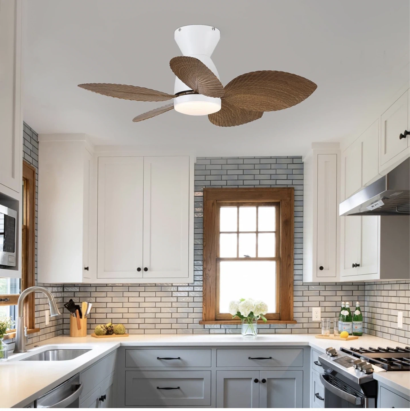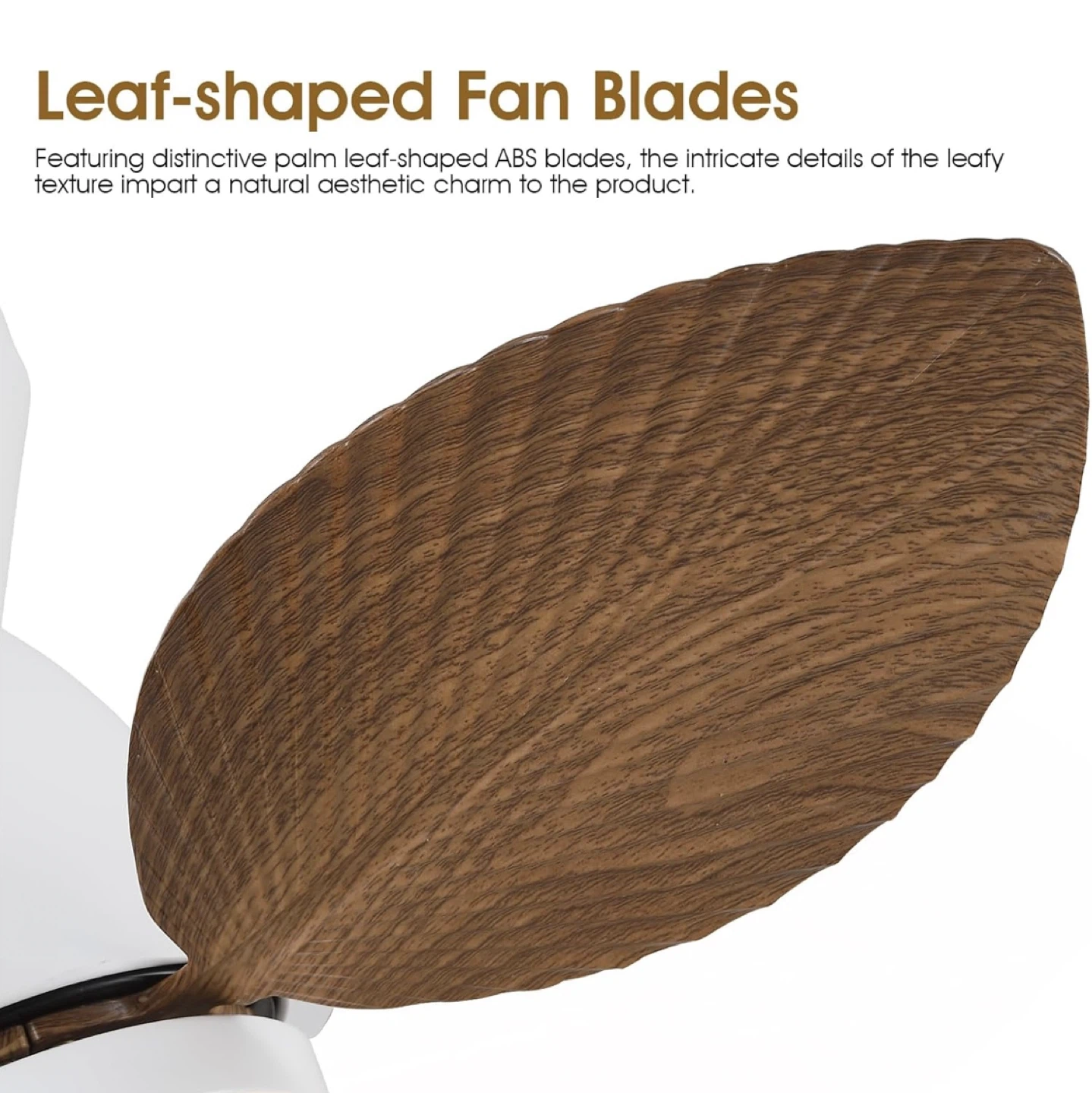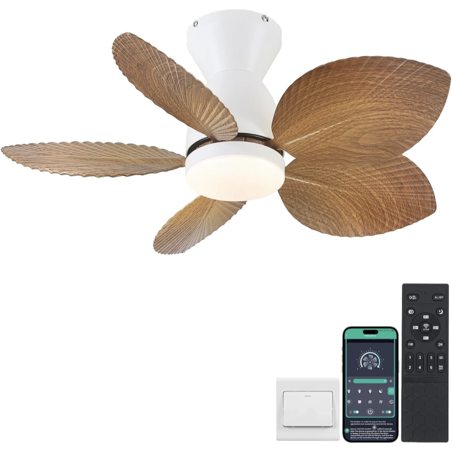 This tropical style ceiling fan features distinctive leaf-shaped ABS blades with a wood grain finish. It includes an LED light and comes with both a remote control and app control options. The fan has a diameter of 30 inches and a height of 11 inches, suitable for small spaces up to 100 sq. ft. It's not suitable for sloped ceilings.