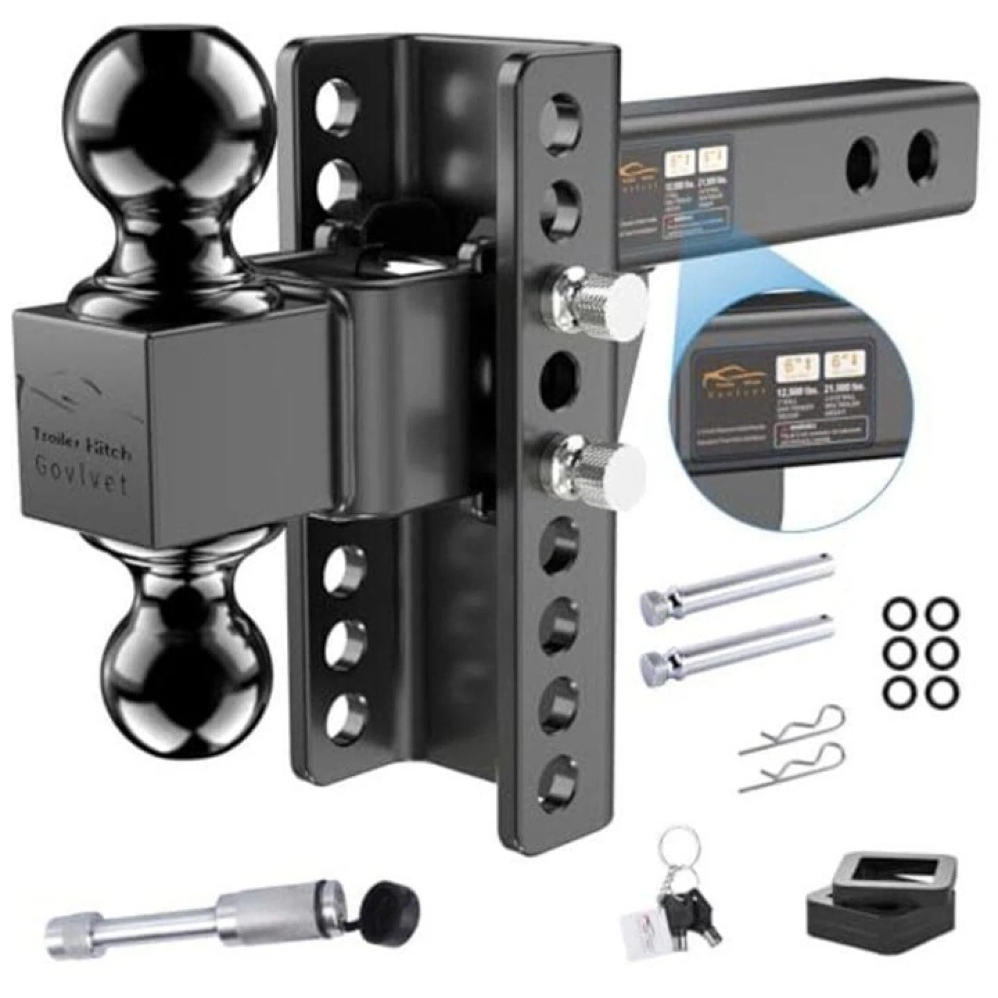 This Govlvet trailer hitch ball mount kit includes dual balls. It comes with a locking pin, keys, and multiple hitch pin clips. Max tongue weight is 2,500 lbs and max towing capacity is 25,000 lbs.