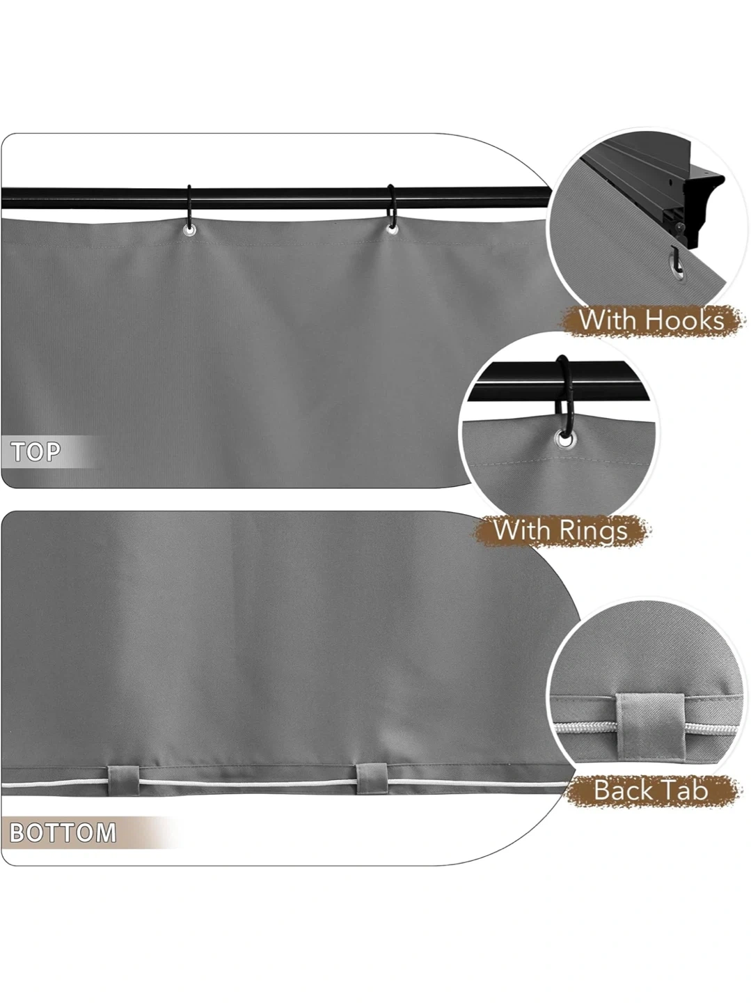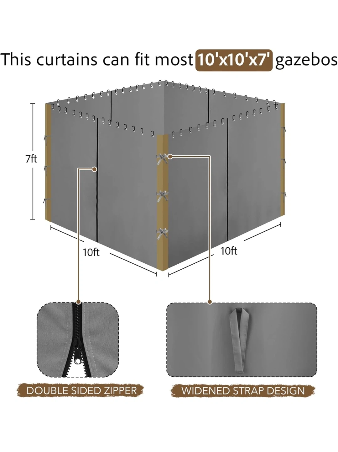 This is a 4-piece set of grey curtains designed for 10'x10' gazebos. They're windproof and include hooks for easy sliding. The curtains feature a double-sided zipper and widened strap design.