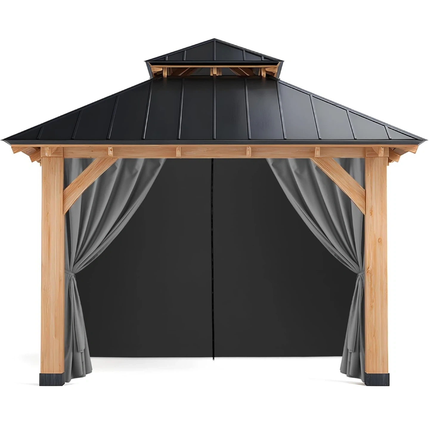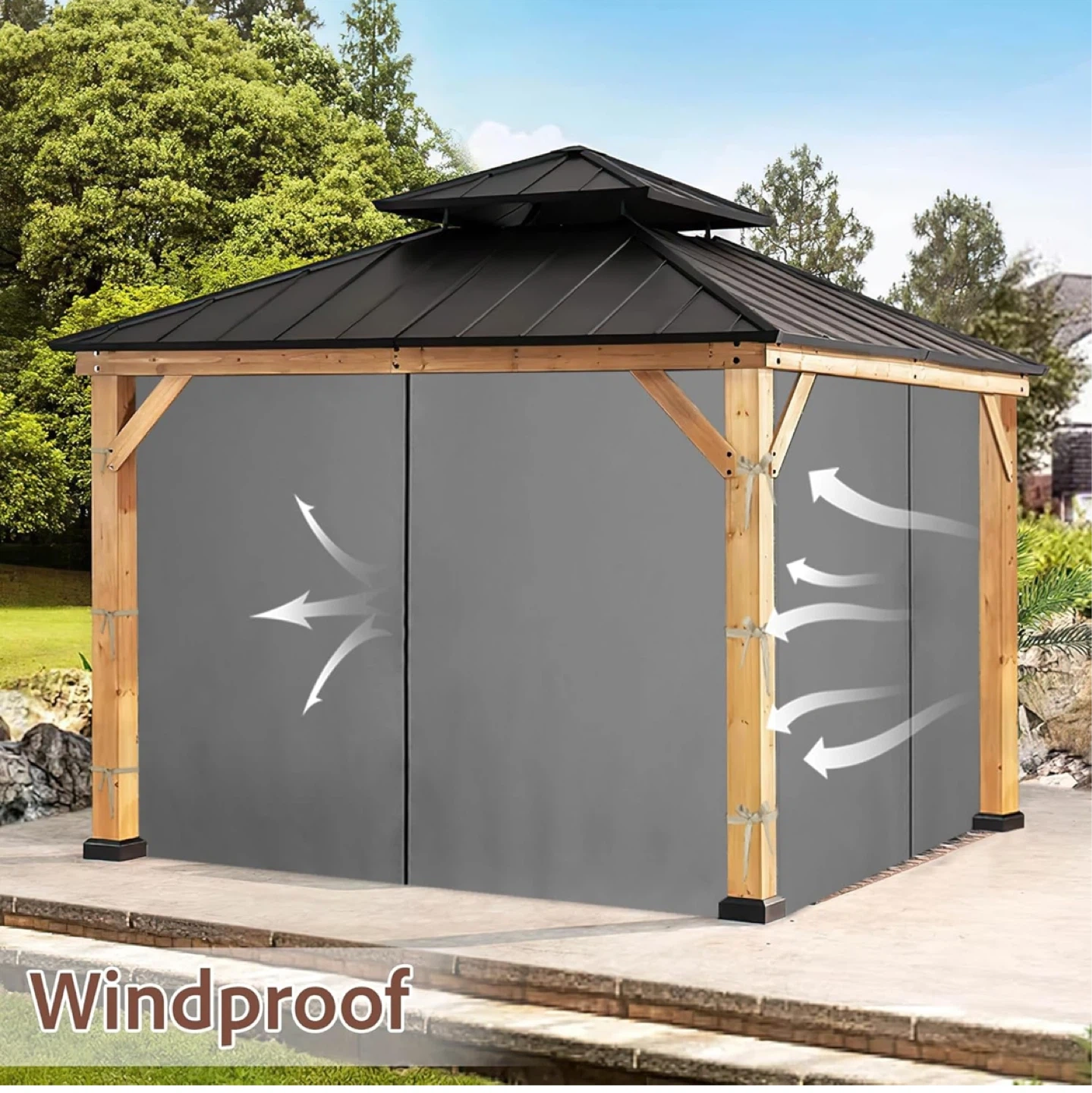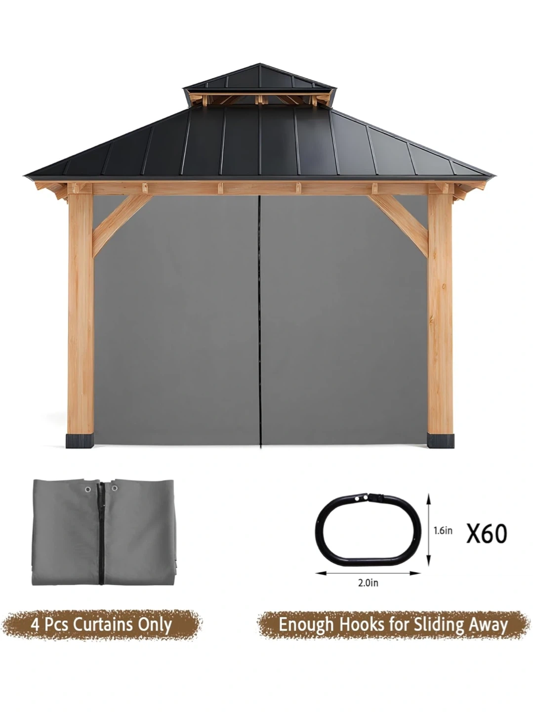 This is a 4-piece set of grey curtains designed for 10'x10' gazebos. They're windproof and include hooks for easy sliding. The curtains feature a double-sided zipper and widened strap design.