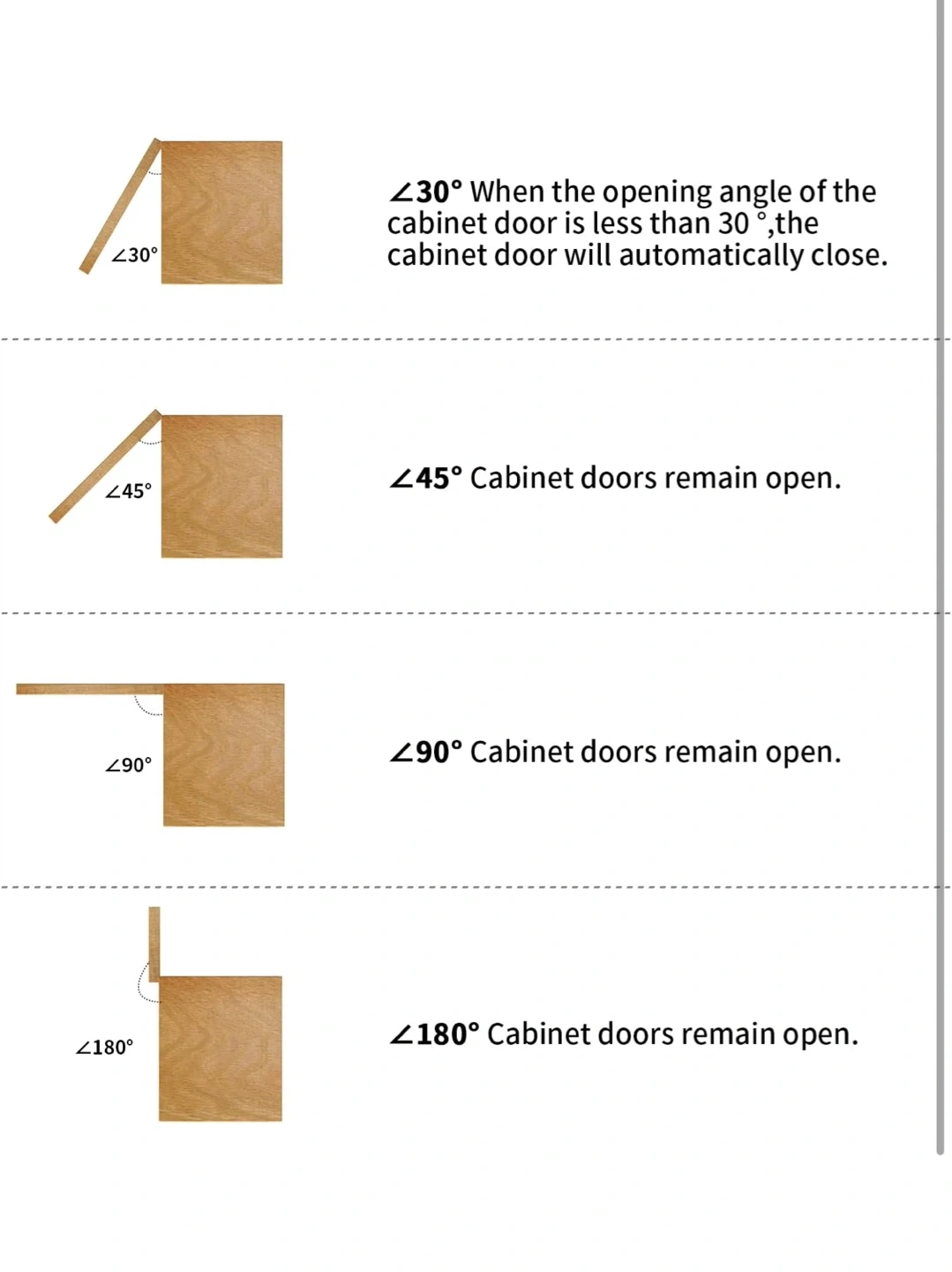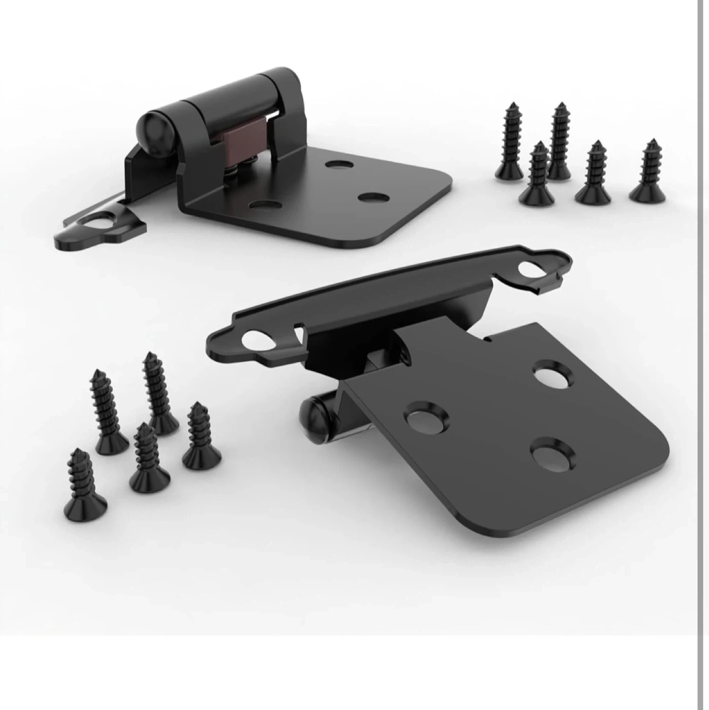 These black overlay cabinet hinges are suitable for overlay cabinet doors with flat boards. They lay flat and include screws for easy installation. Cabinet doors remain open at various angles, automatically closing when the opening angle is less than 30 degrees.