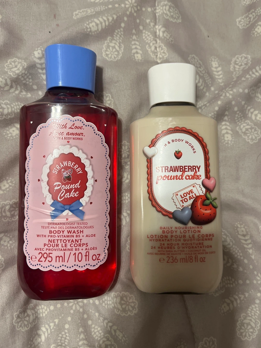 This set includes a Bath & Body Works Strawberry Pound Cake body wash and a daily nourishing body lotion. The body wash is 10 fl oz (295 ml) and the lotion is 8 fl oz (236 ml). Both are dermatologist tested and infused with provitamin B5 + aloe, shea butter, and coconut oil for hydration.