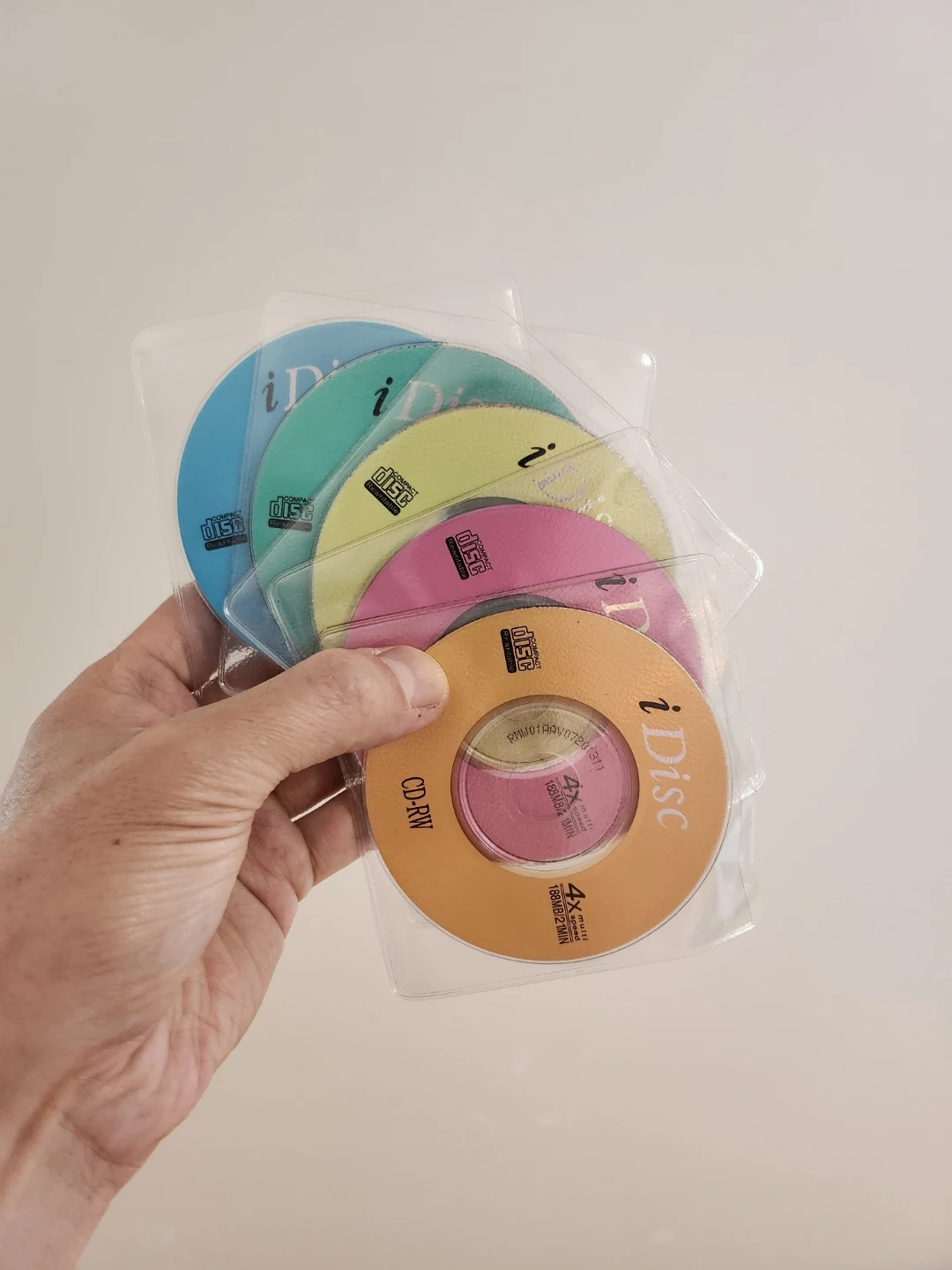 iDisc mini CD-RWs, which are small, rewritable compact discs with a diameter of 80mm. These are specifically rated for a maximum write speed of 4x and can store 188 megabytes of data or 21 minutes of audio.