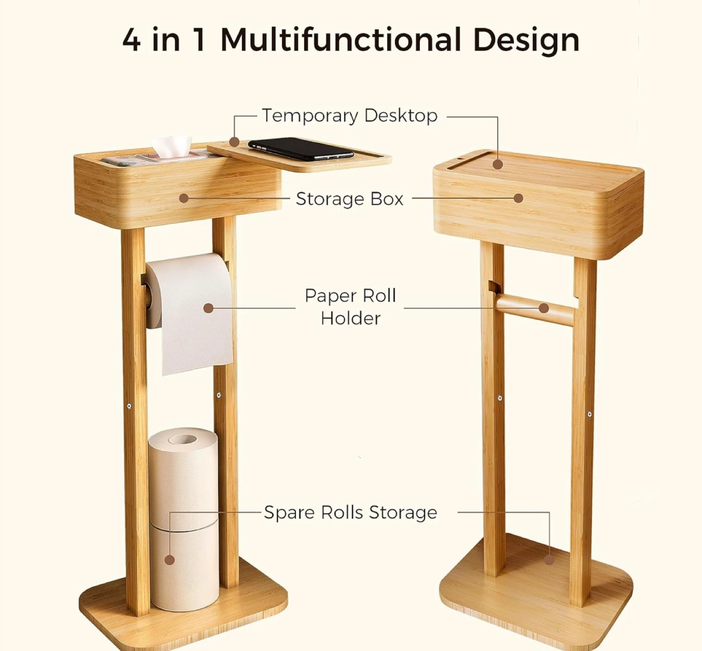 This 4-in-1 multifunctional bamboo toilet paper stand offers a paper roll holder and spare roll storage. It features a top storage box with a 360° rotatable lid that acts as a temporary desktop for your phone or other small items. It's a handy addition to any bathroom!