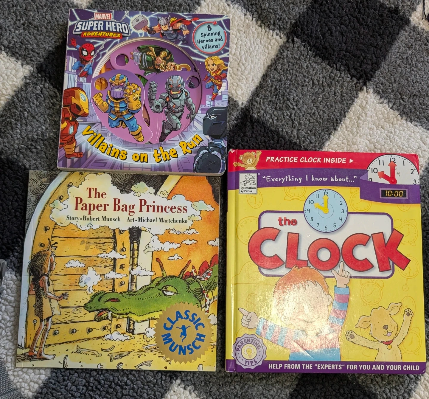 This lot includes three children's books. Marvel Super Hero Adventures: Villains on the Run features spinning heroes and villains. The Paper Bag Princess is a classic story by Robert Munsch. 'Everything I know about...' The Clock is a practice clock book. These books are great for young readers and learning activities. $5 for all