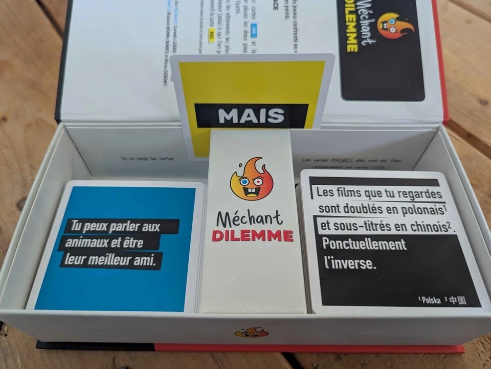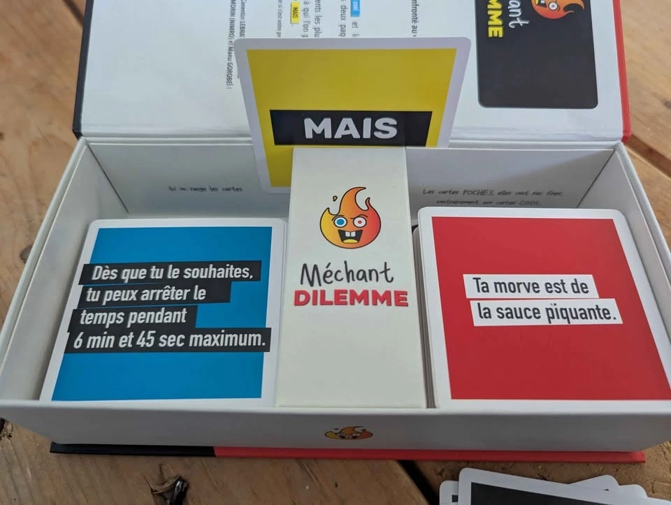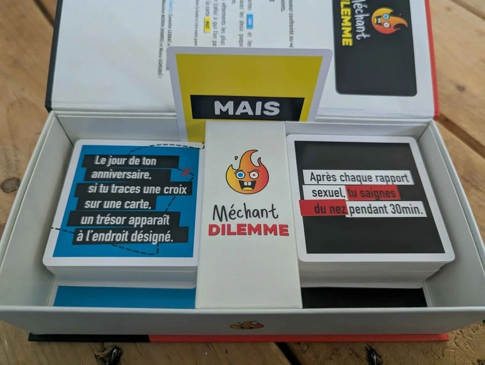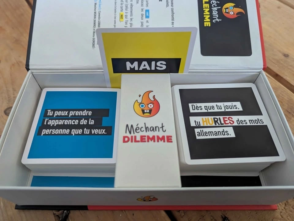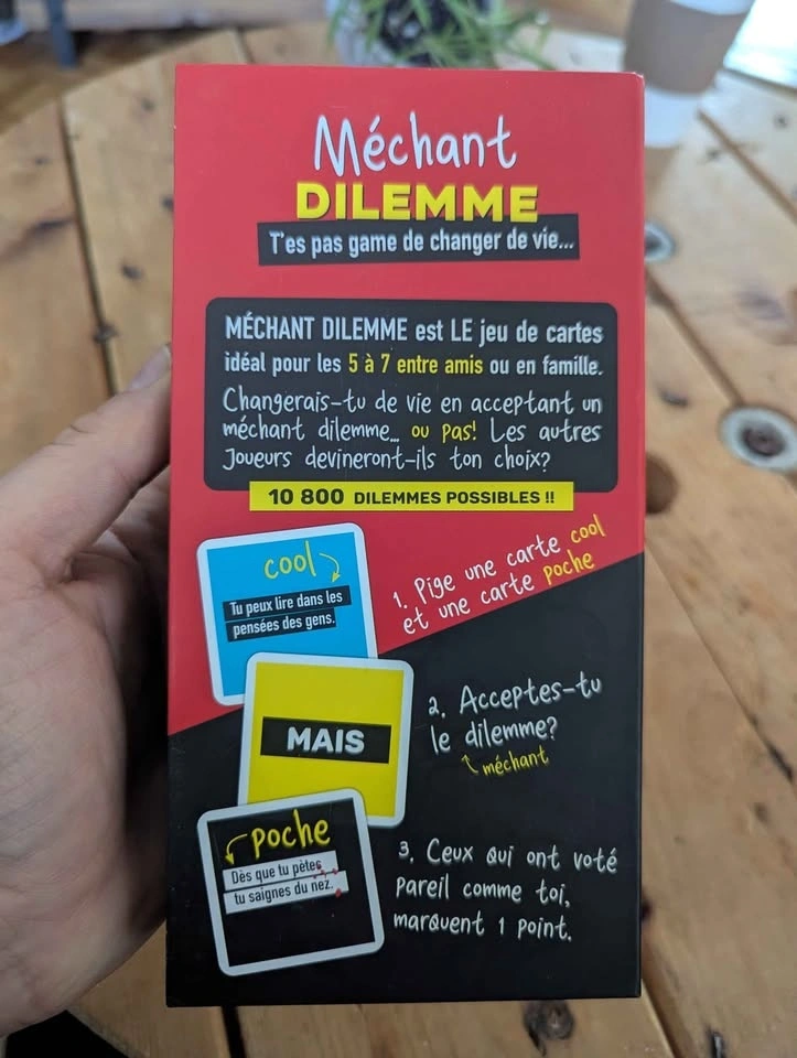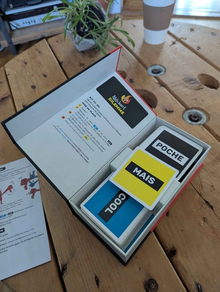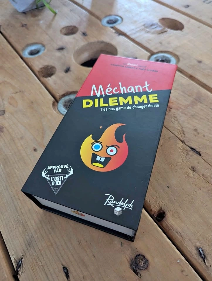 Want to change your life? Méchant Dilemme is the perfect game to test your friends' limits and liven up your evenings! 🍻 The concept is simple: you're presented with two impossible choices and you have to decide. It's funny, it's raw, and it guarantees memorable discussions. Why you want it: ✅ Impeccable condition: The box is super clean (see photos). ✅ Quality from here: A Randolph game, approved by Osti d'Jeu. ✅ Quick: 20-minute games that flow well. Technical details: Players: 2 to 10 Duration: 20 min Age: 16+ (for mature audiences!) Price: $20 (usually sells for $32 + taxes) Location: H2L1T5 (near Beaudry)
