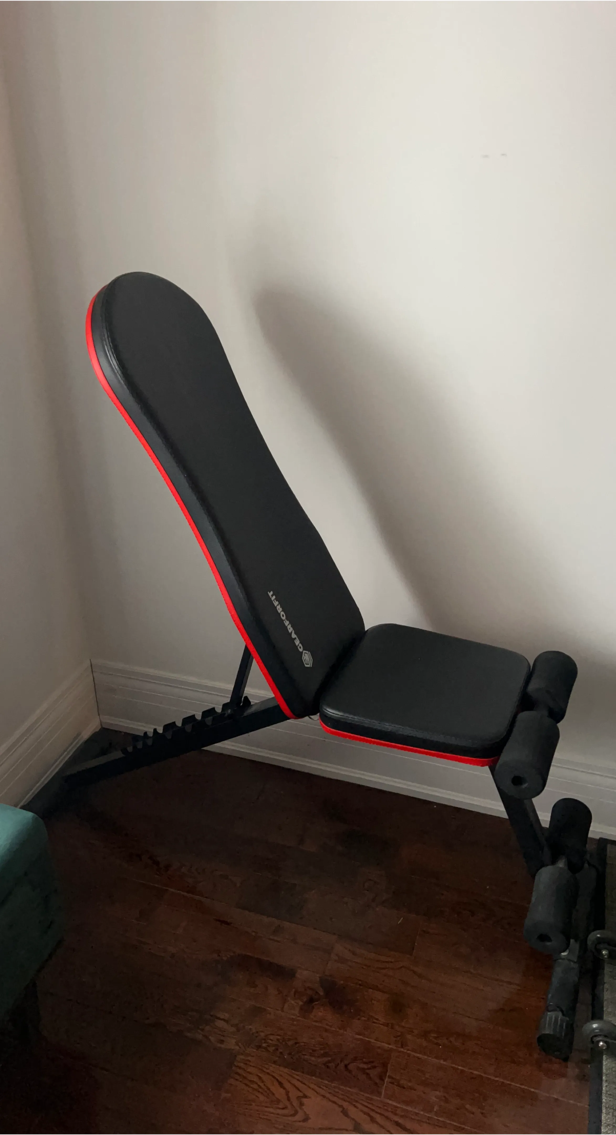 This is a GearForFit adjustable weight bench. It has black padding with red trim. It's suitable for a home gym.