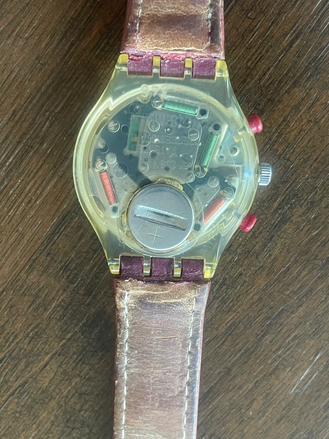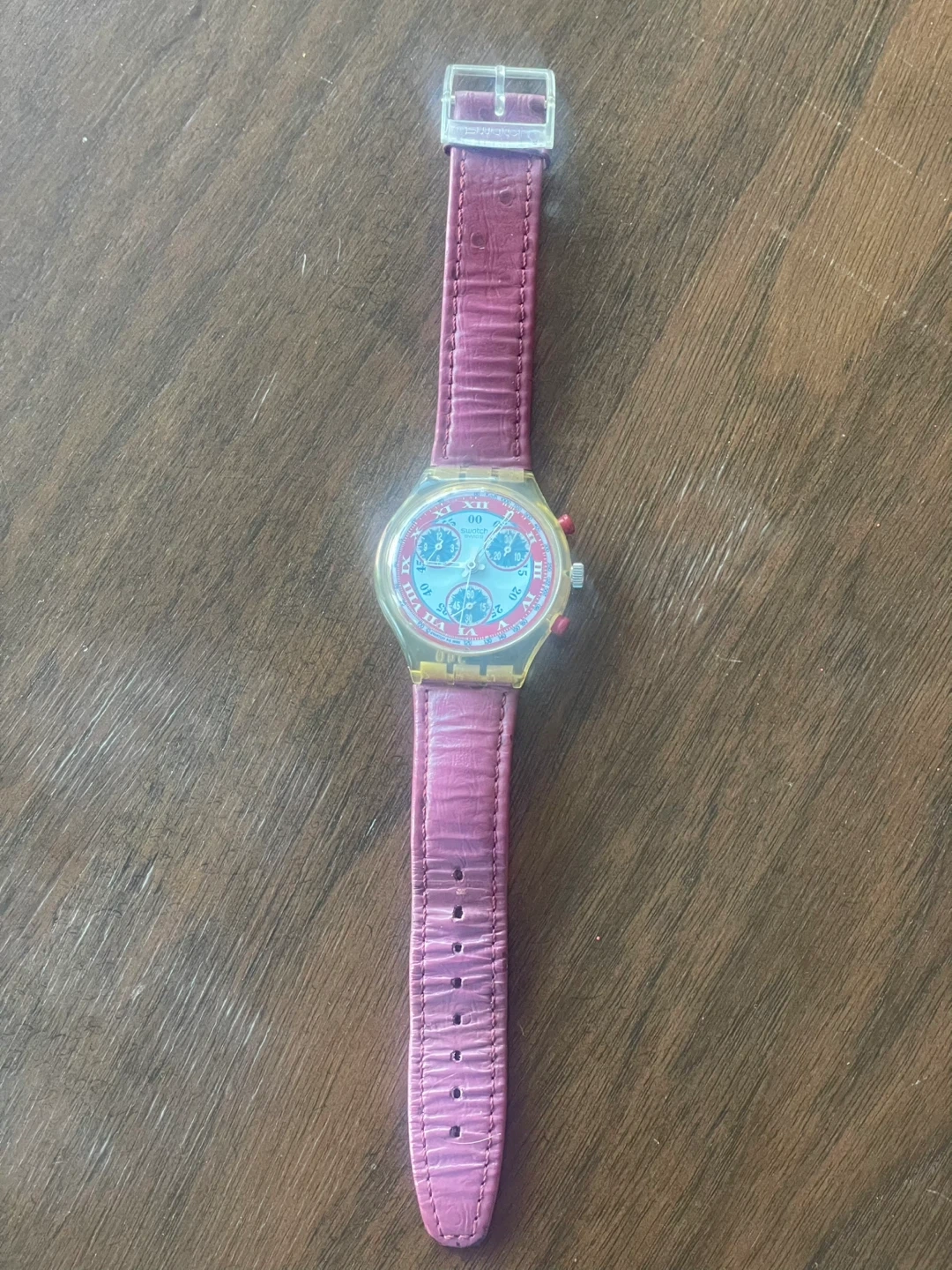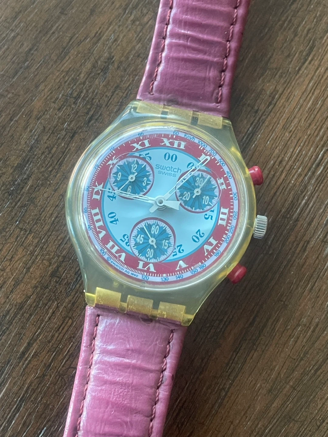 This Swatch WINDMILL chronograph watch features a clear plastic case with a pink leather strap and a colourful dial. It has a functional date display and three sub-dials. The watch is made of durable materials and is designed for everyday wear. 1993
