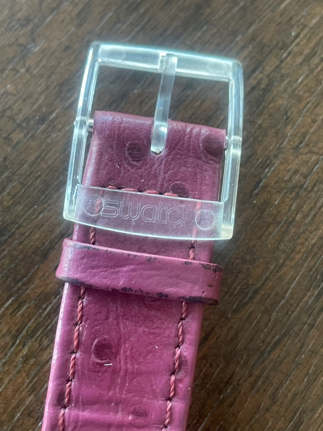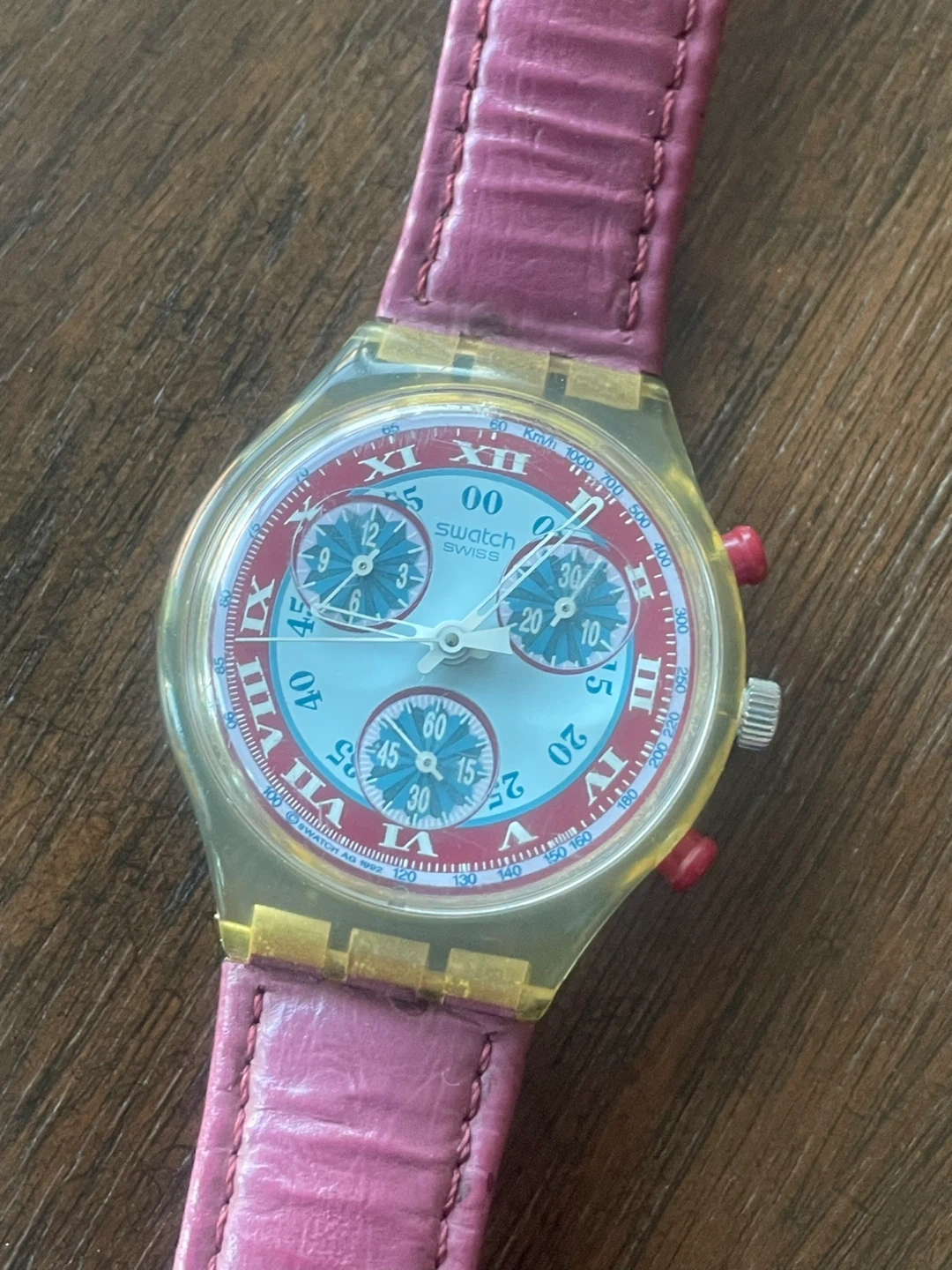 This Swatch WINDMILL chronograph watch features a clear plastic case with a pink leather strap and a colourful dial. It has a functional date display and three sub-dials. The watch is made of durable materials and is designed for everyday wear. 1993