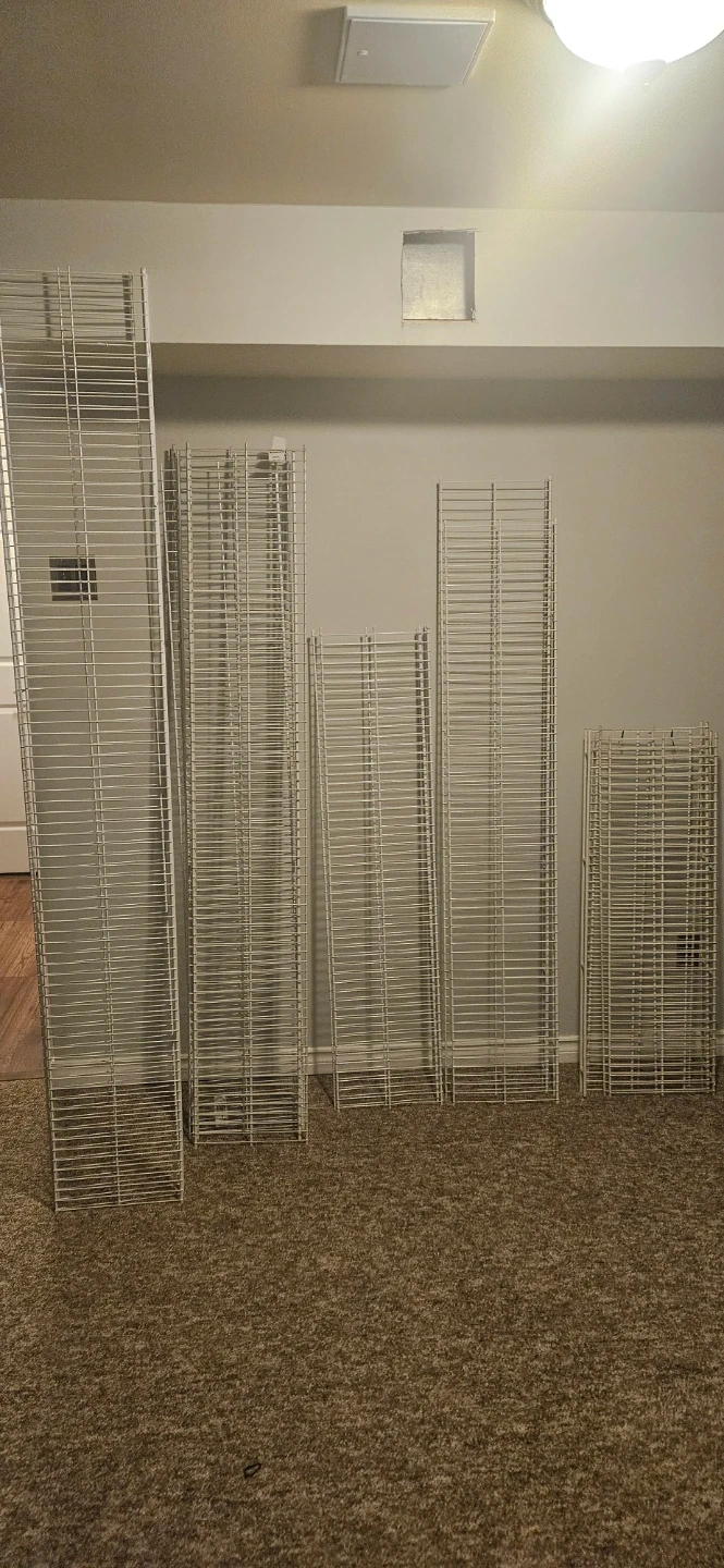 Set of white wire shelving units. Various heights for custom organization needs. These are great for garages or storage rooms! $5 each