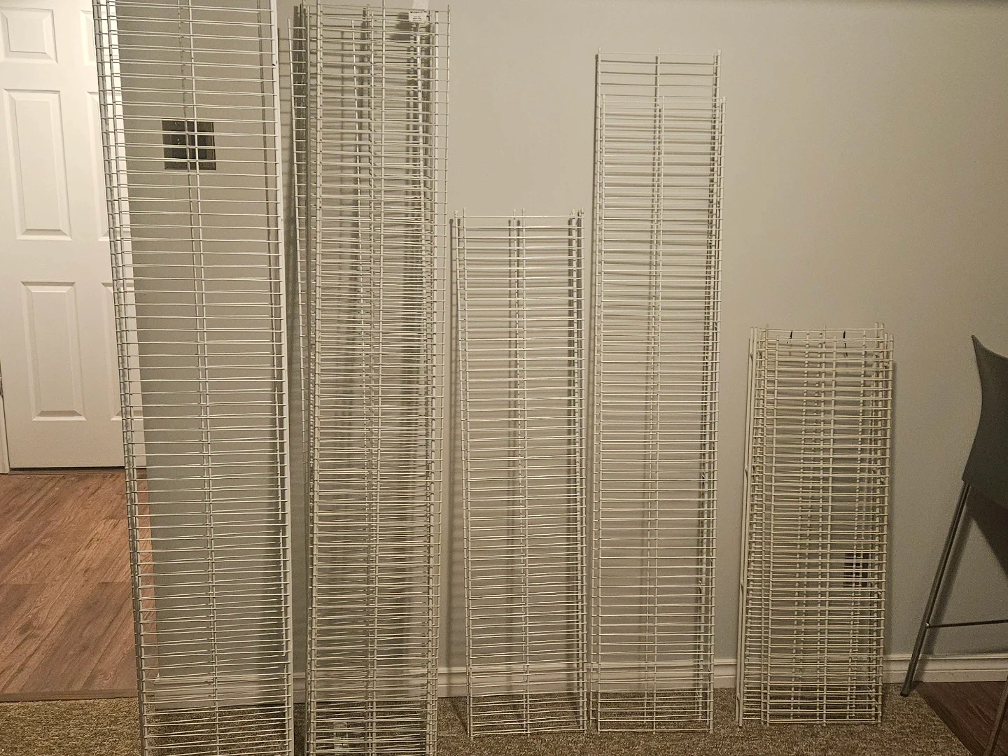 Set of white wire shelving units. Various heights for custom organization needs. These are great for garages or storage rooms! $5 each