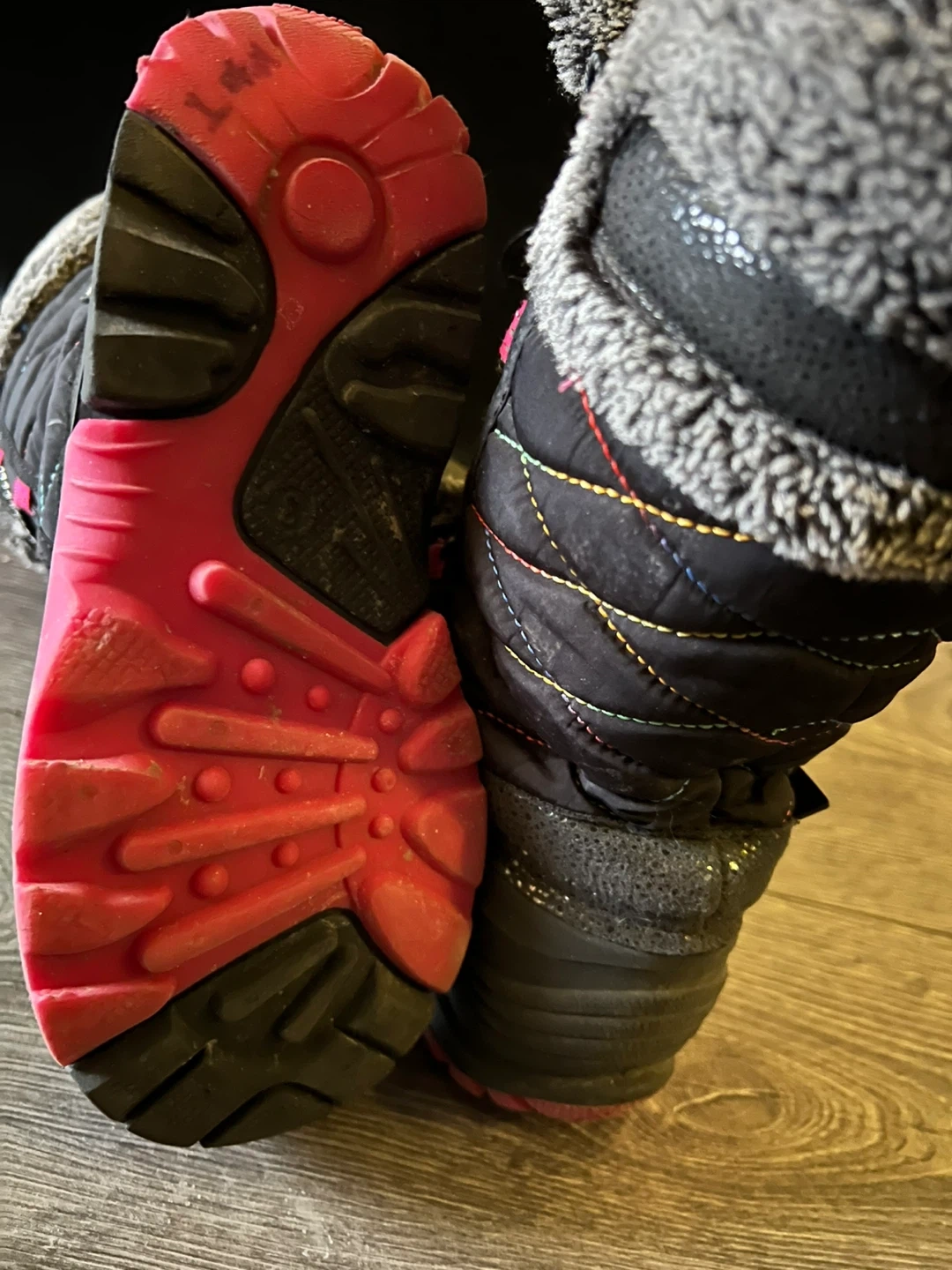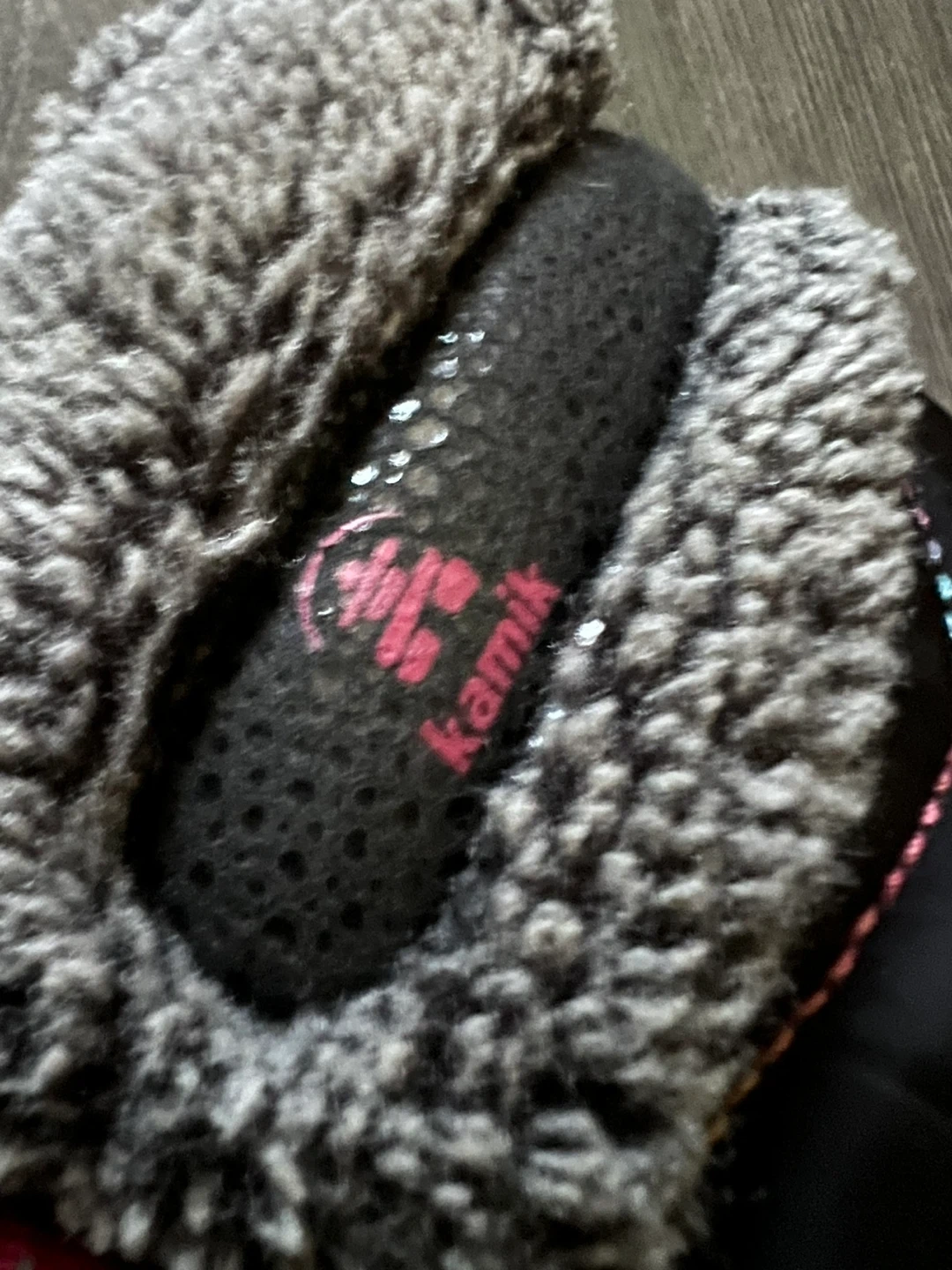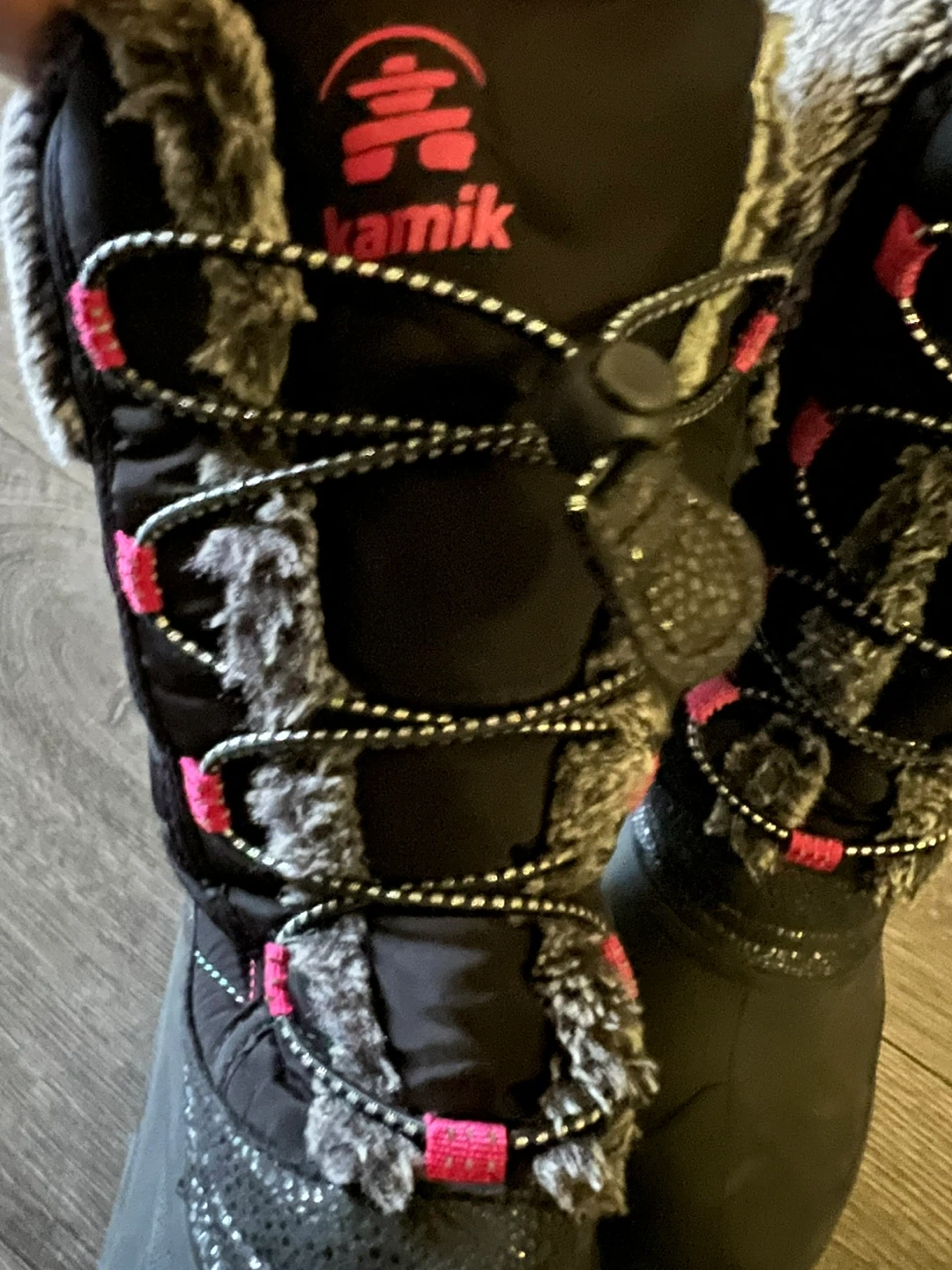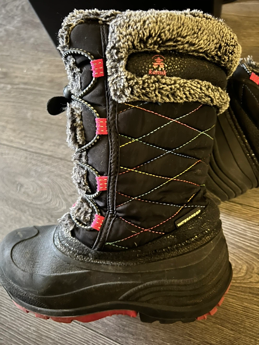 These black Kamik boots feature a cozy faux fur lining and colourful stitching details. They're waterproof, perfect for keeping toes warm and dry during winter adventures. The drawstring closure ensures a snug fit.