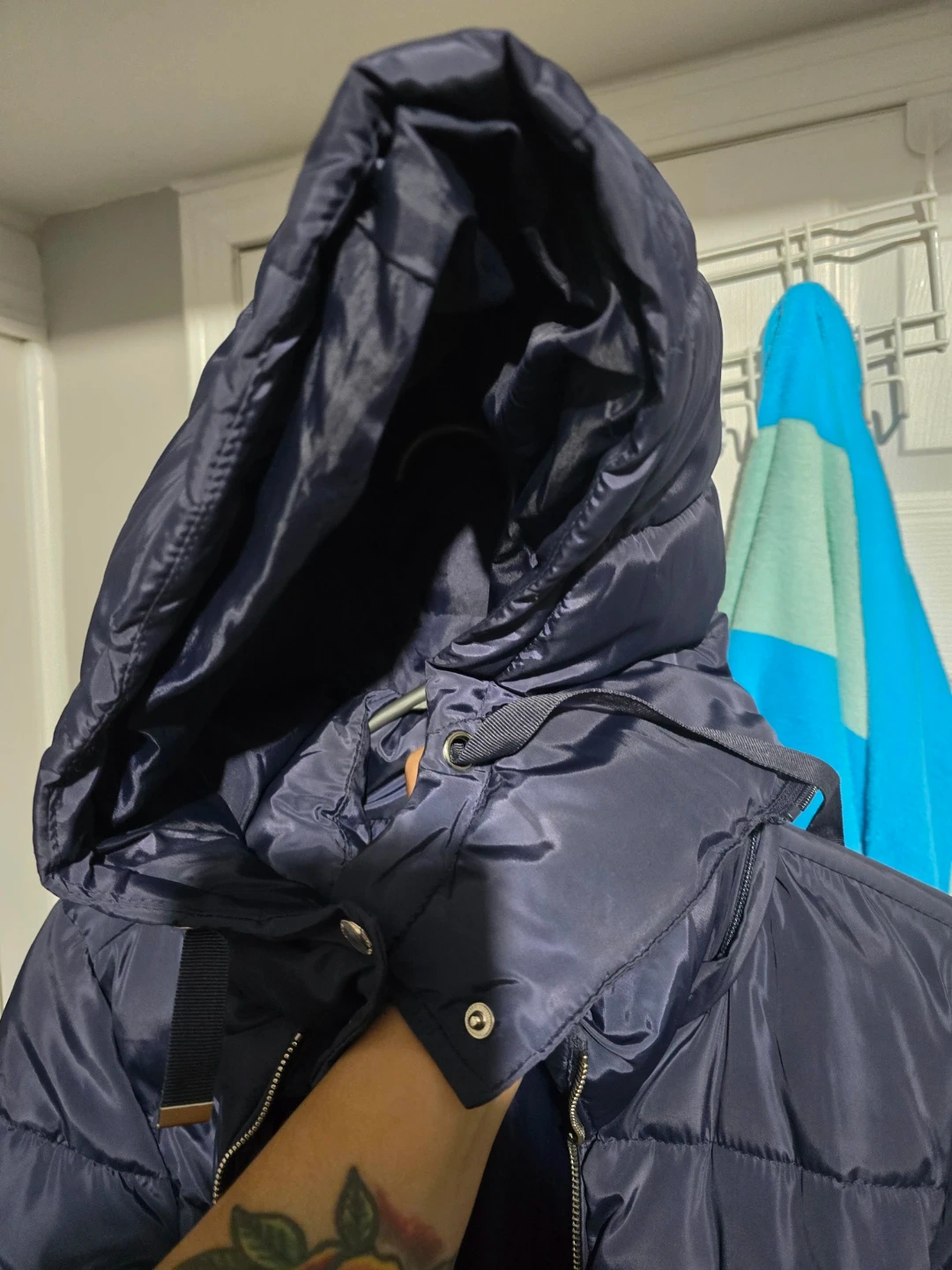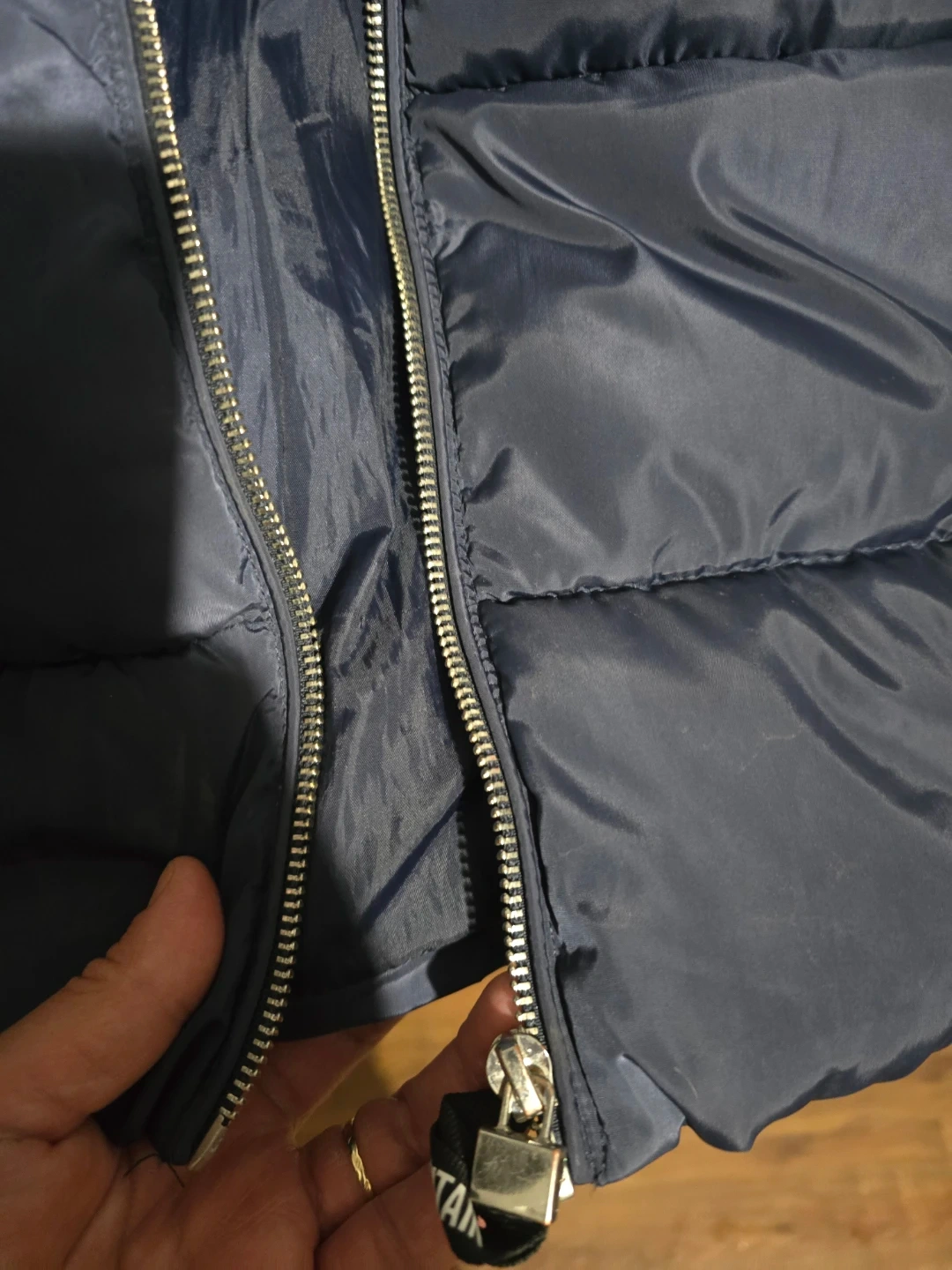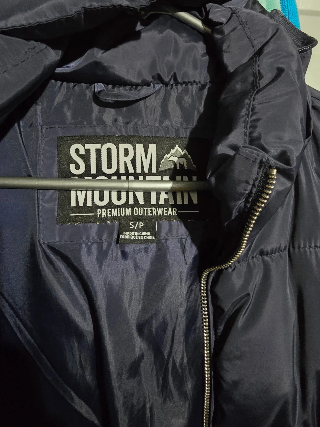 A navy blue puffer coat from Storm Mountain. It's a size S/P. Features a full zip front, multiple zippered pockets, and a hood.