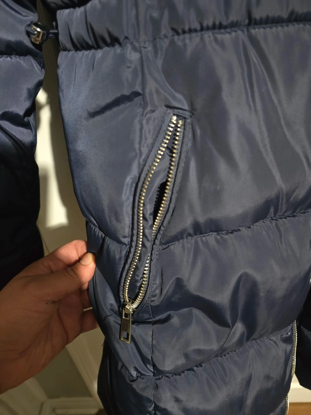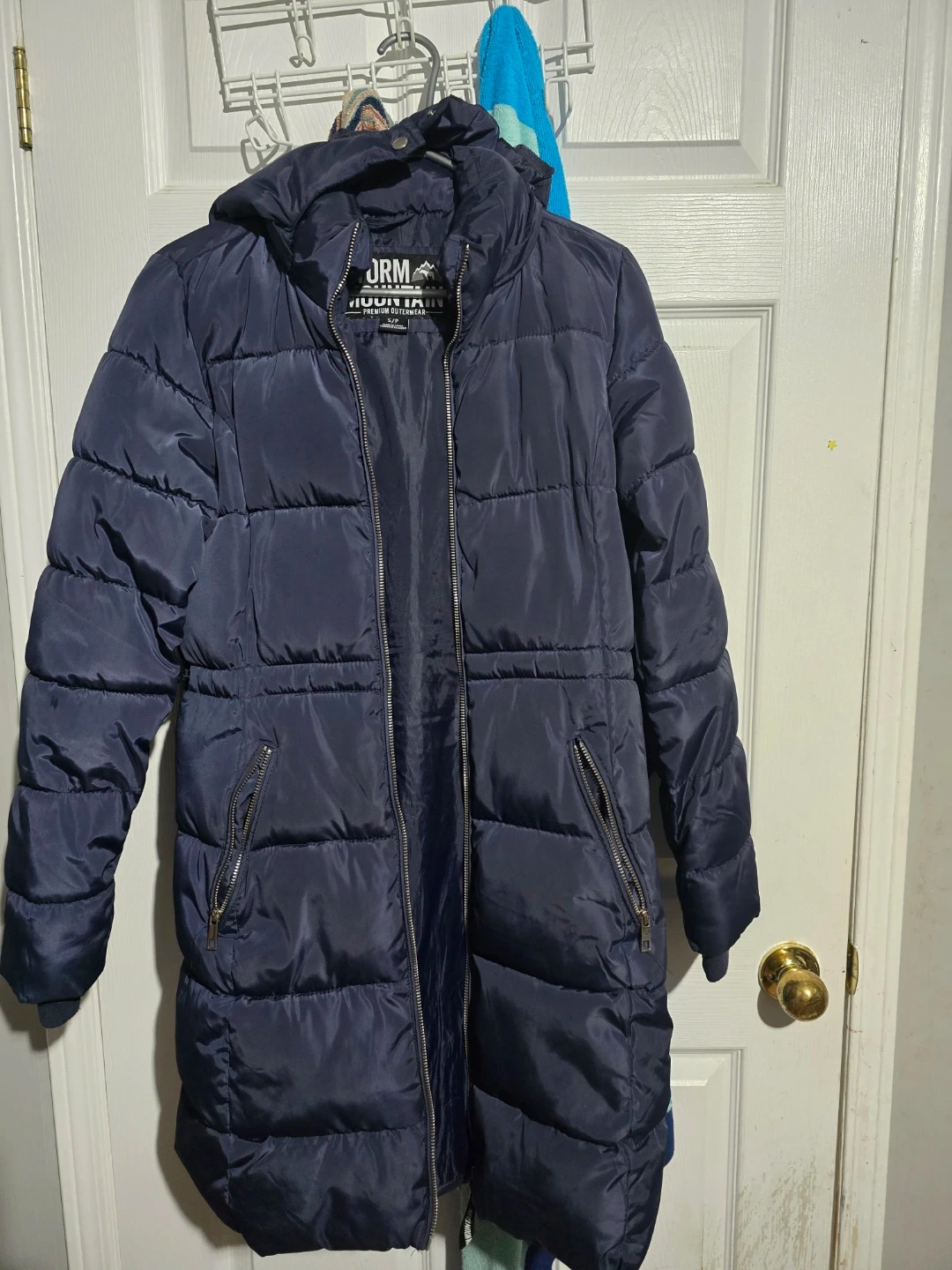 A navy blue puffer coat from Storm Mountain. It's a size S/P. Features a full zip front, multiple zippered pockets, and a hood.