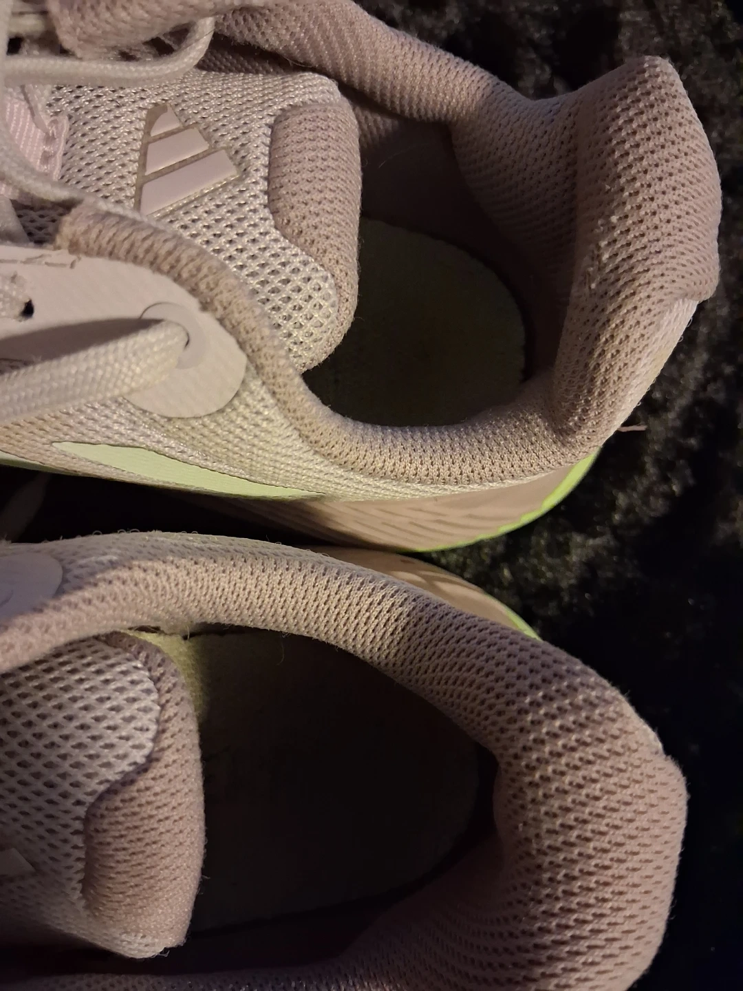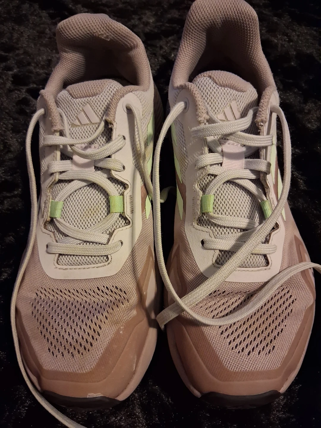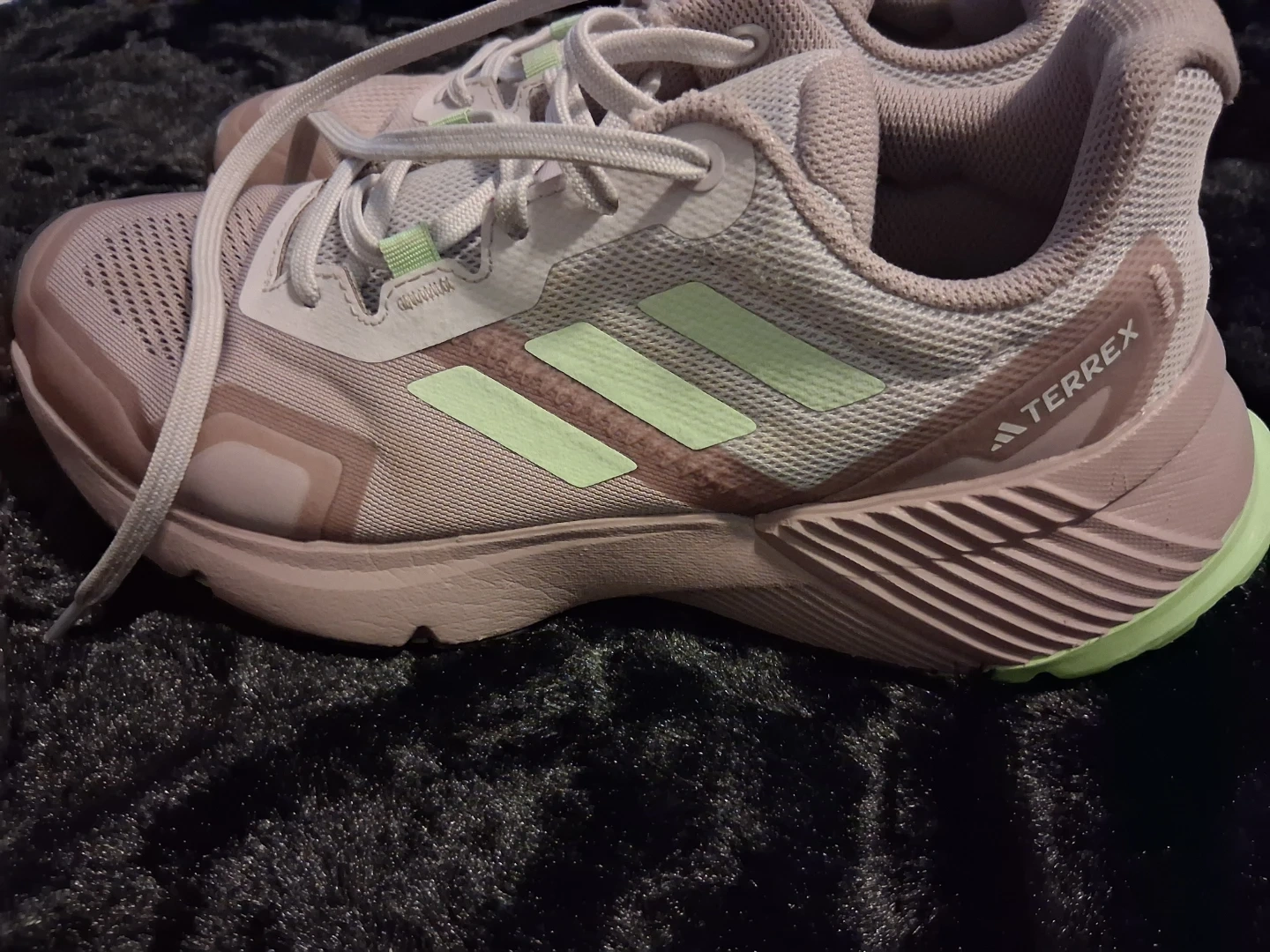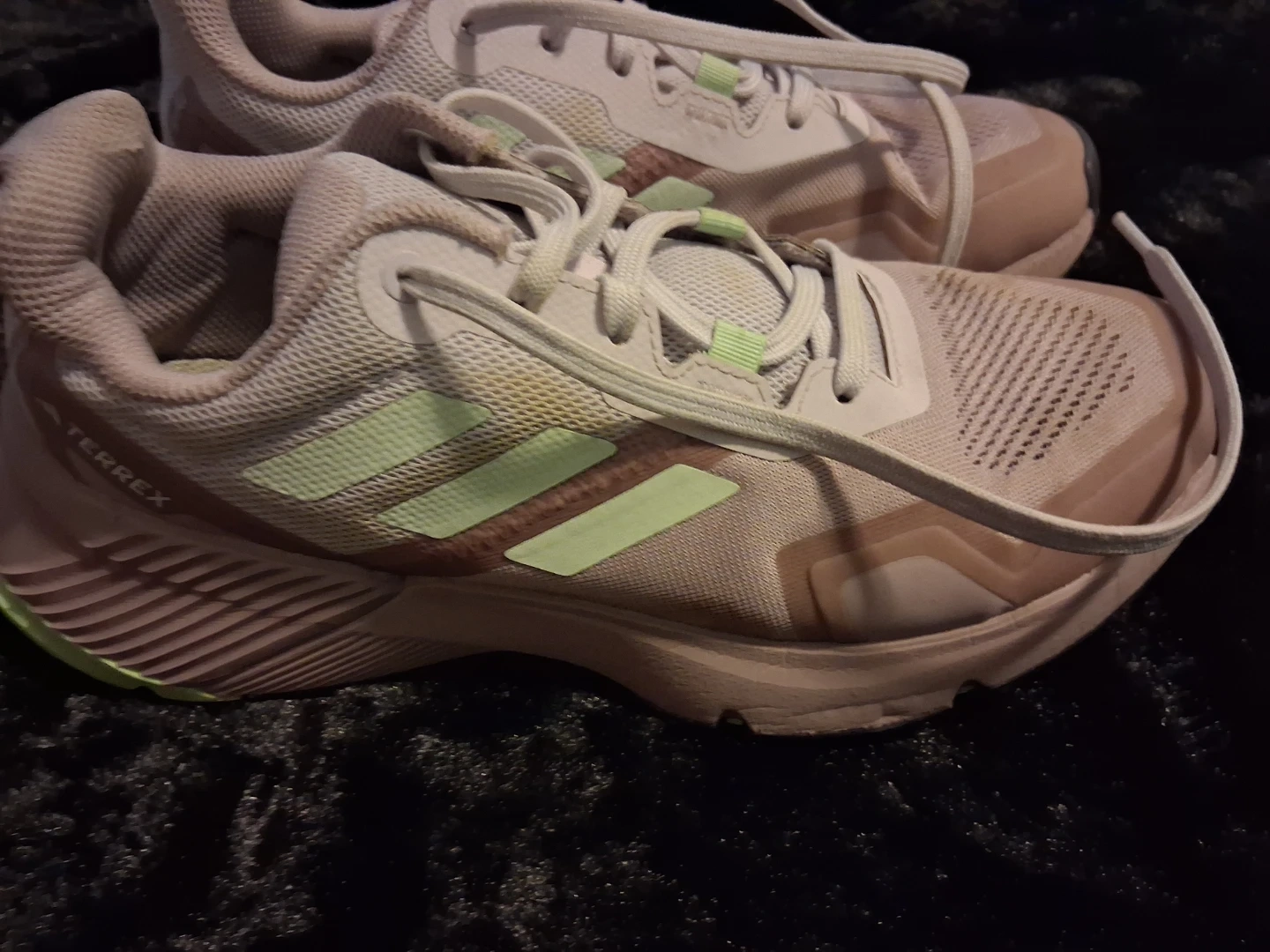These Adidas Terrex trail running shoes are designed for outdoor adventures. They feature a breathable mesh upper and a durable rubber outsole for excellent traction. The light pink and light green color scheme adds a stylish touch. Size 7½