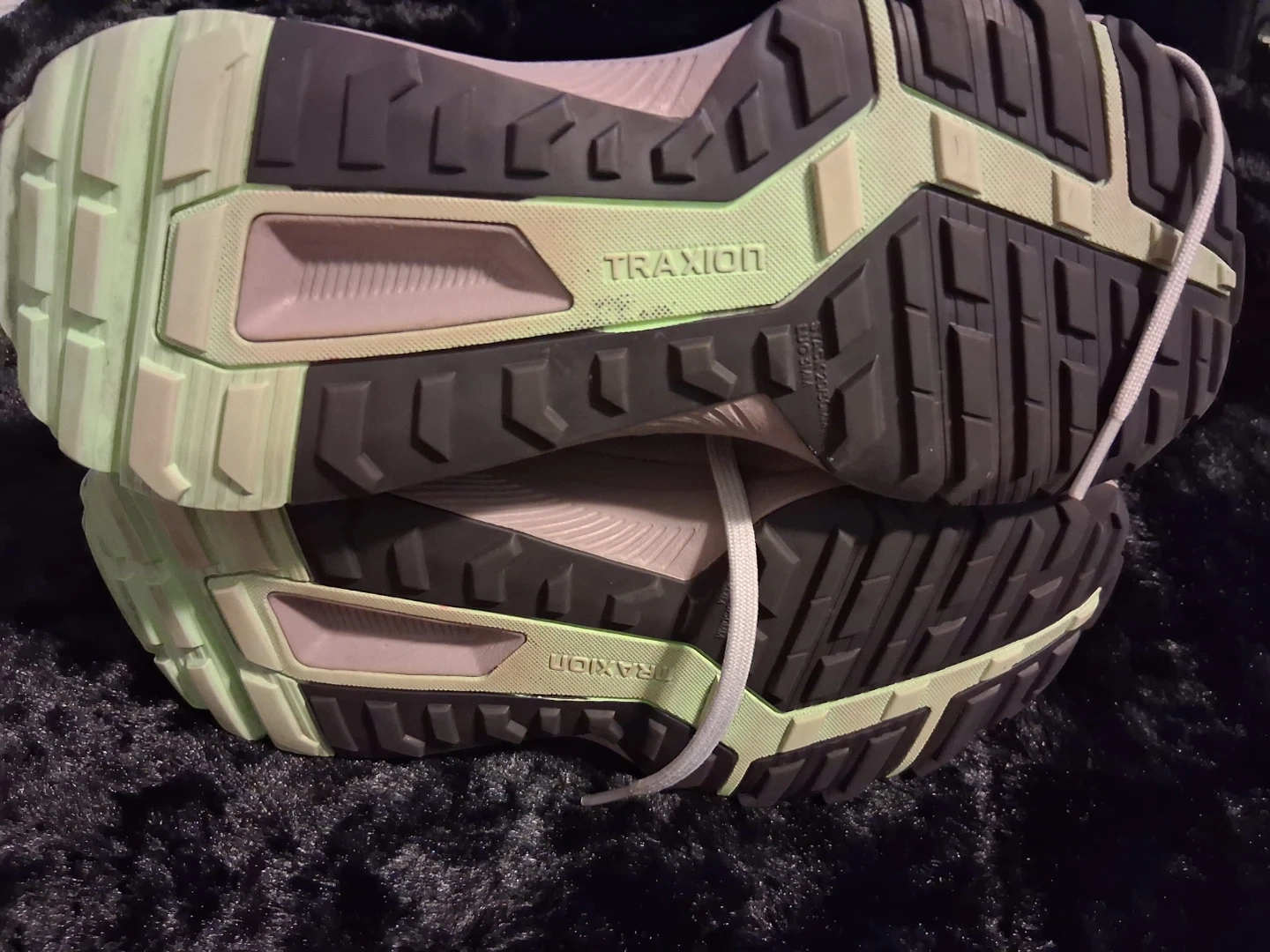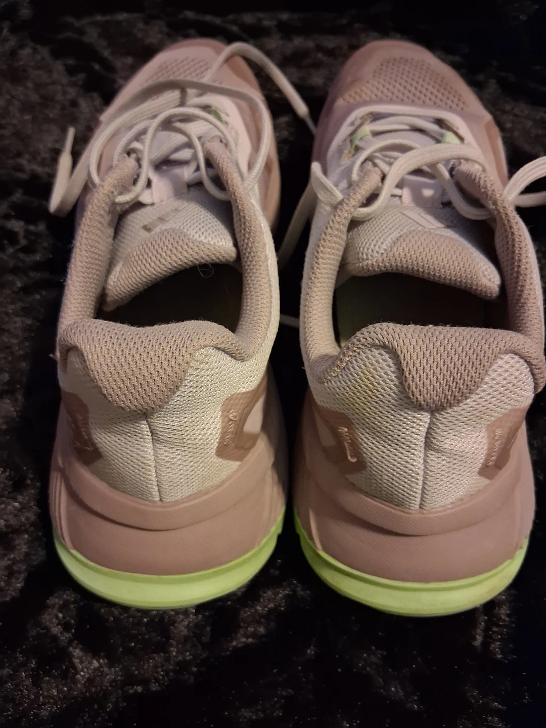 These Adidas Terrex trail running shoes are designed for outdoor adventures. They feature a breathable mesh upper and a durable rubber outsole for excellent traction. The light pink and light green color scheme adds a stylish touch. Size 7½
