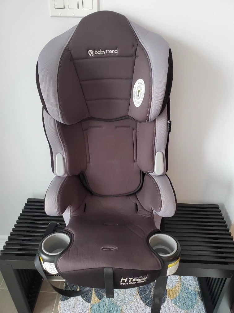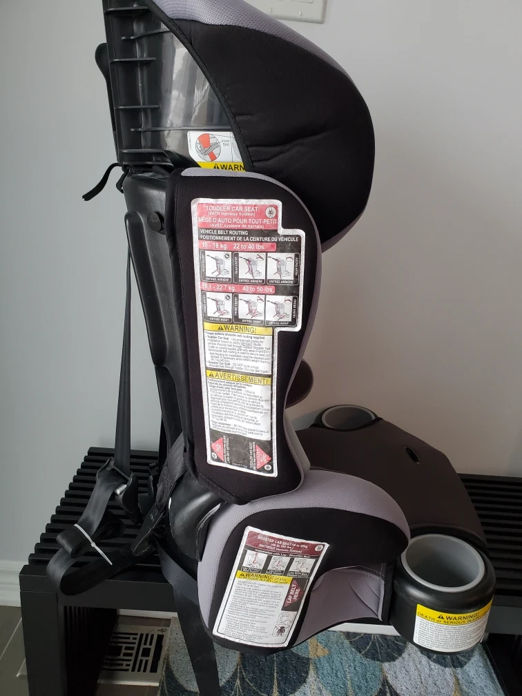 NOTE: The inside safety harness/buckle was removed so that the car seat could be used as booster seat only. Unfortunately, they are now misplaced. Price reflects this, but you can use a three-point harness if you purchase it separately and just slip it through. The buckles to secure the carseat to the vehicle seat ARE present though.