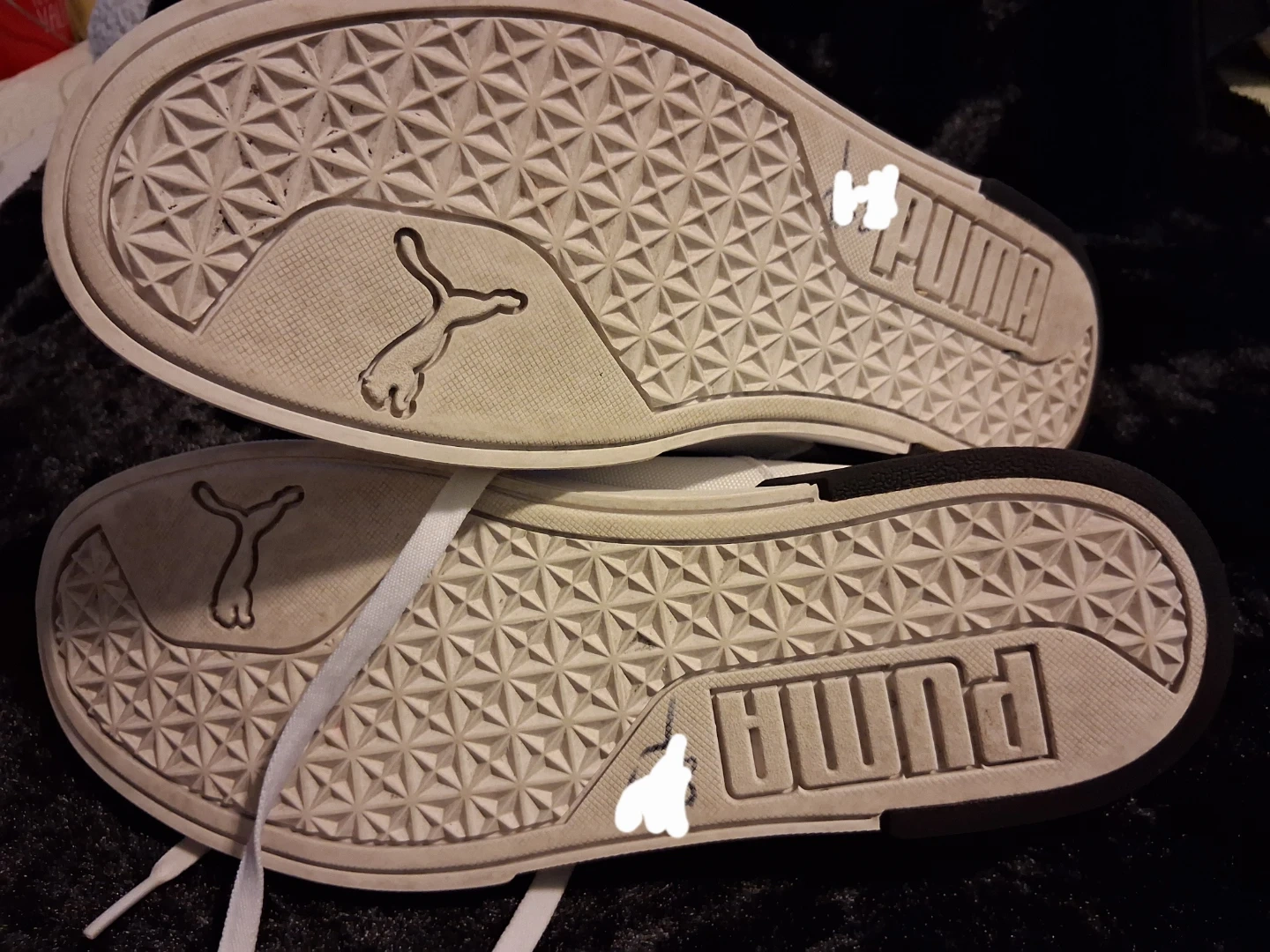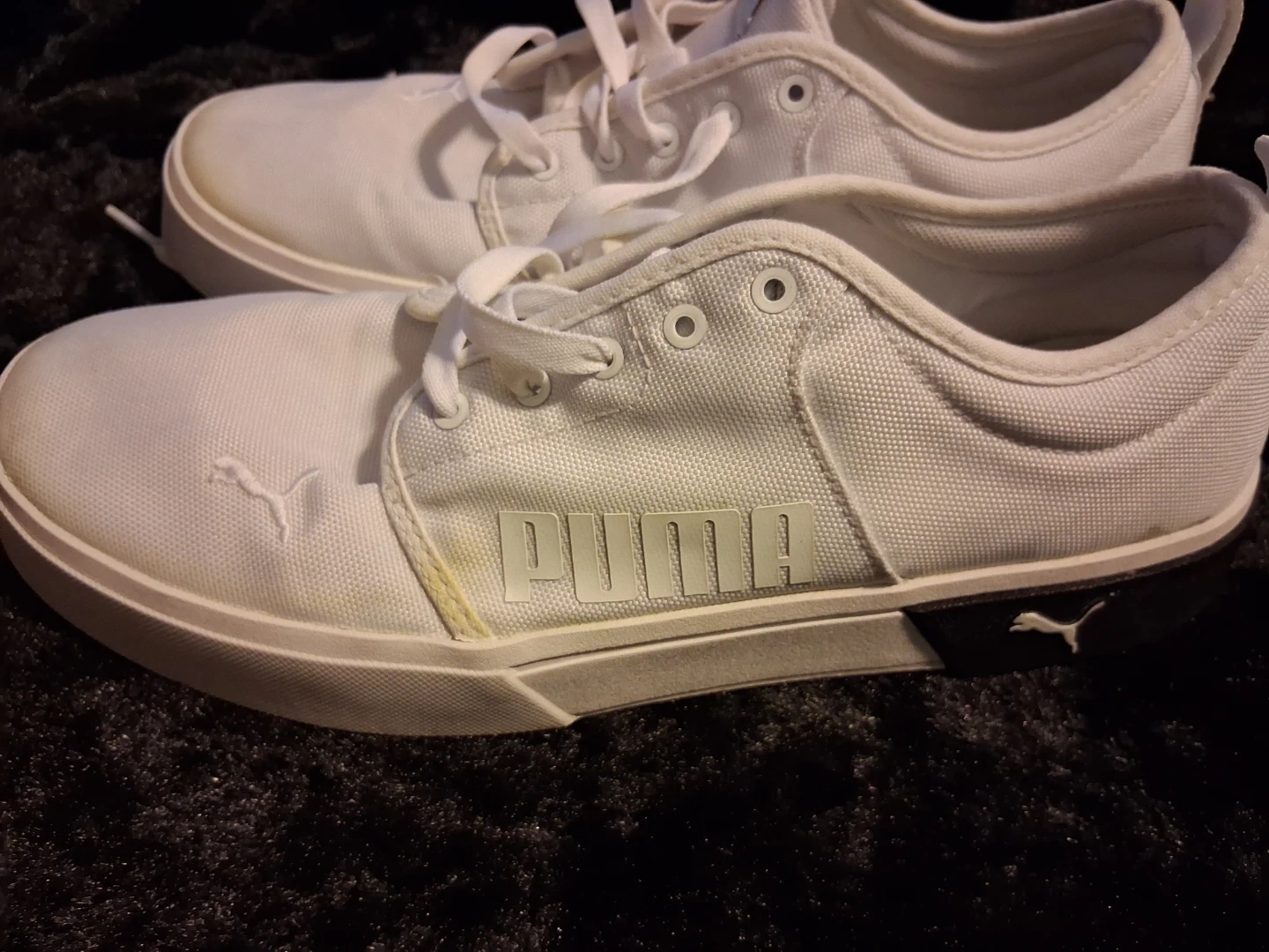 White Puma sneakers with "SoftFoam+" insoles. Canvas upper and rubber sole. These are casual shoes.