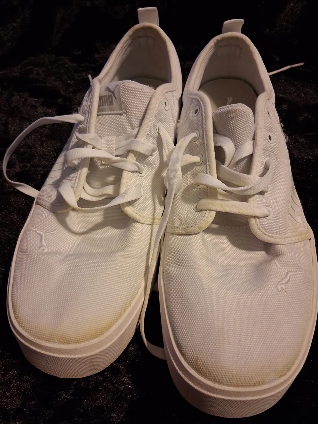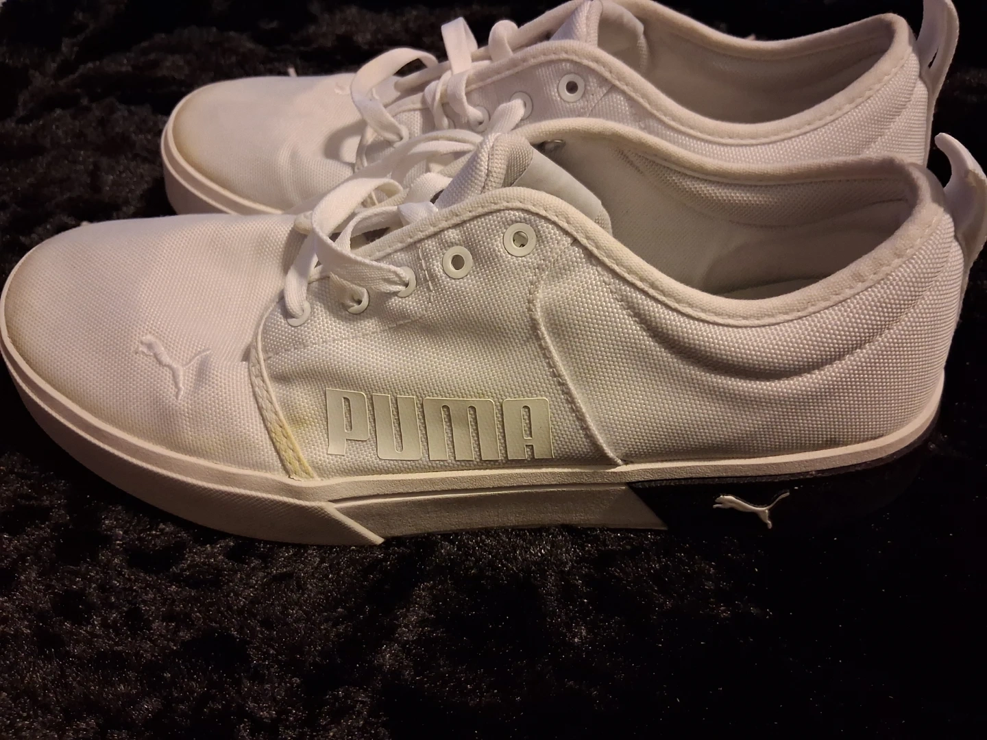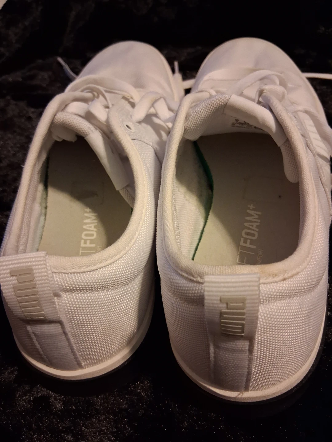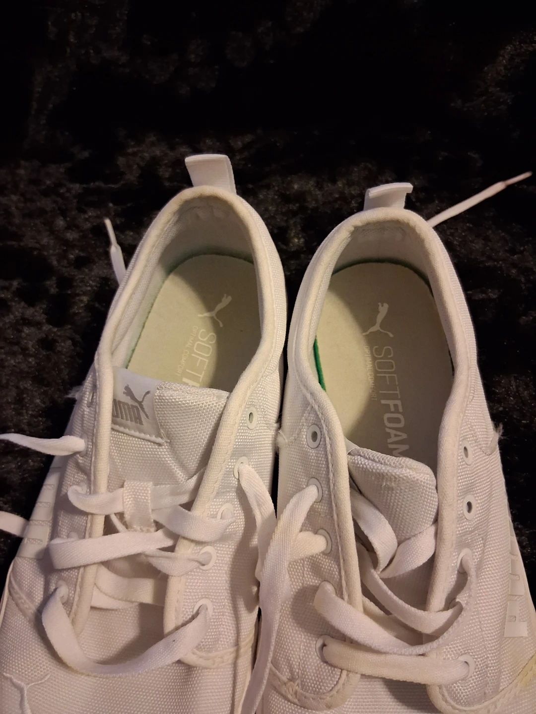 White Puma sneakers with "SoftFoam+" insoles. Canvas upper and rubber sole. These are casual shoes.