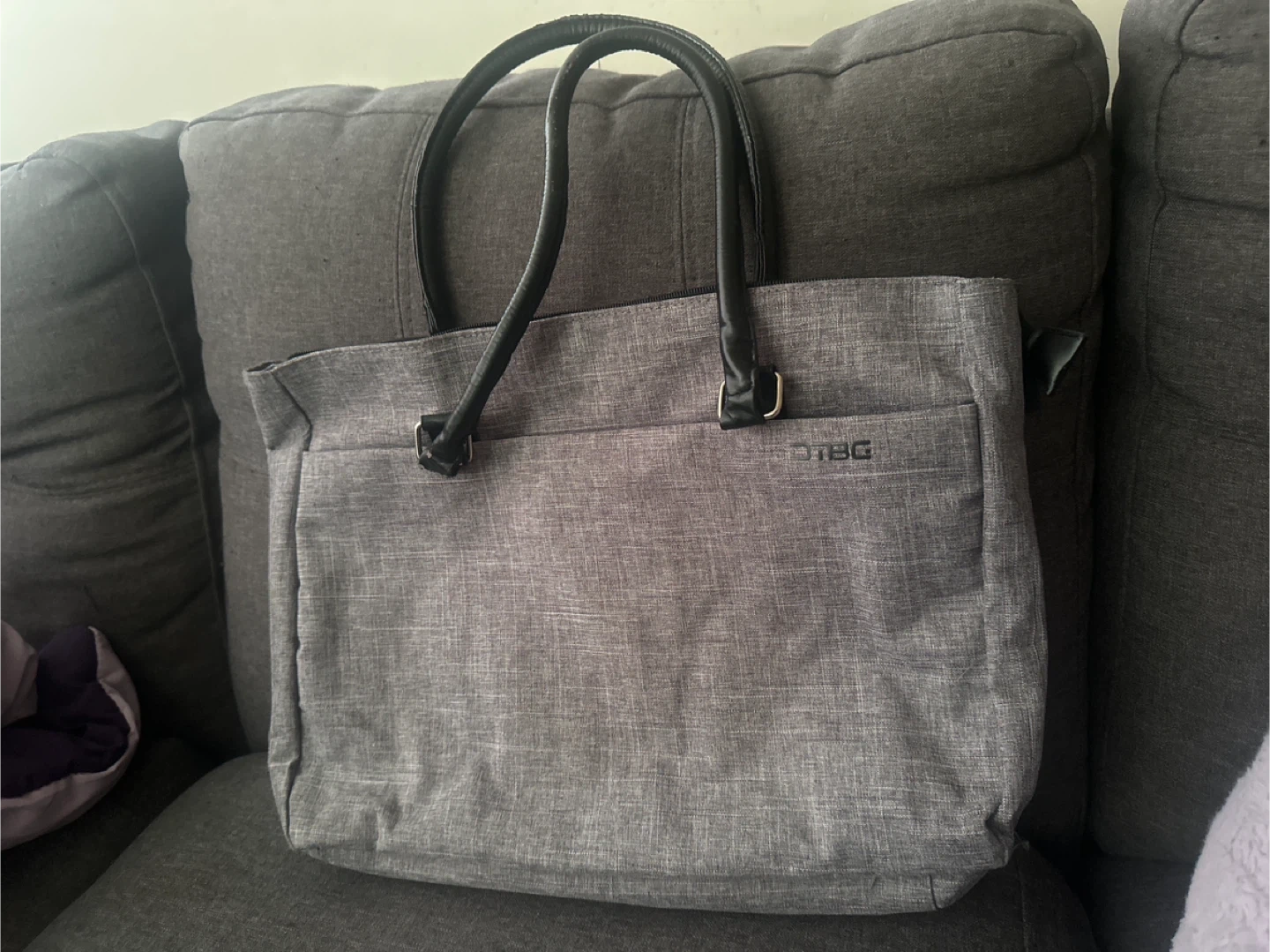 DTBG grey tote bag with faux leather handles. It has a zippered main compartment and a front pocket. Great for carrying your laptop and essentials!
