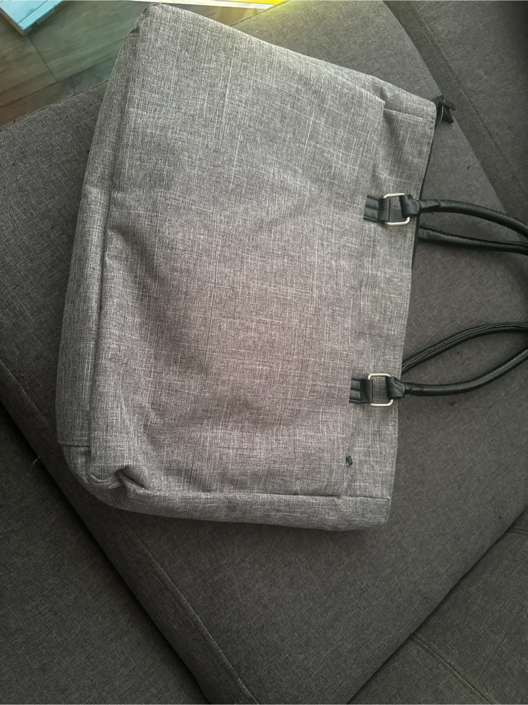 DTBG grey tote bag with faux leather handles. It has a zippered main compartment and a front pocket. Great for carrying your laptop and essentials!