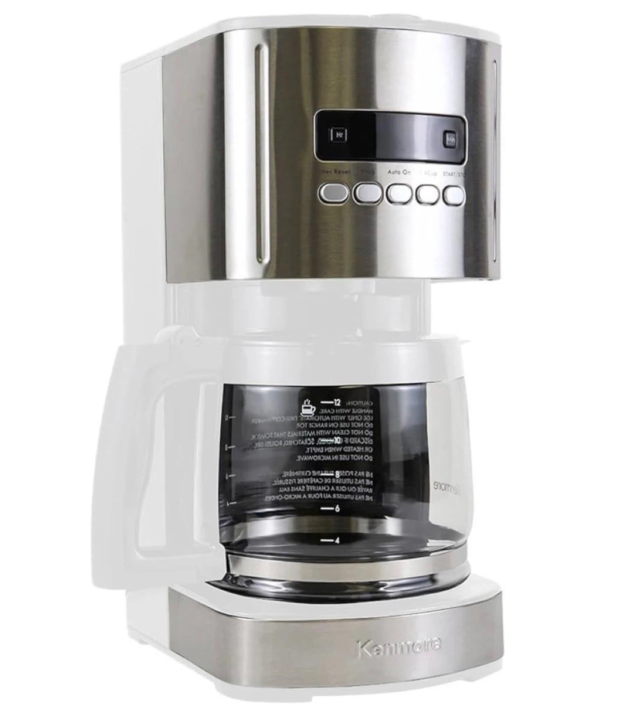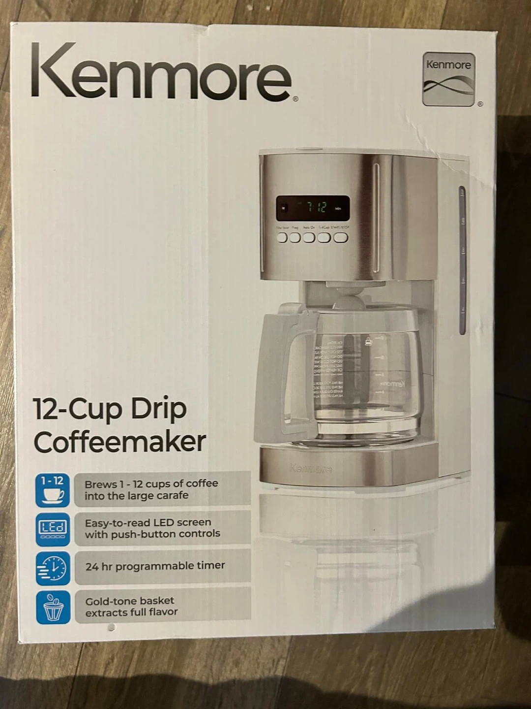This Kenmore coffee maker brews 1-12 cups of coffee. It features an easy-to-read LED screen with push-button controls and a 24-hour programmable timer. The gold-tone basket extracts full flavour.