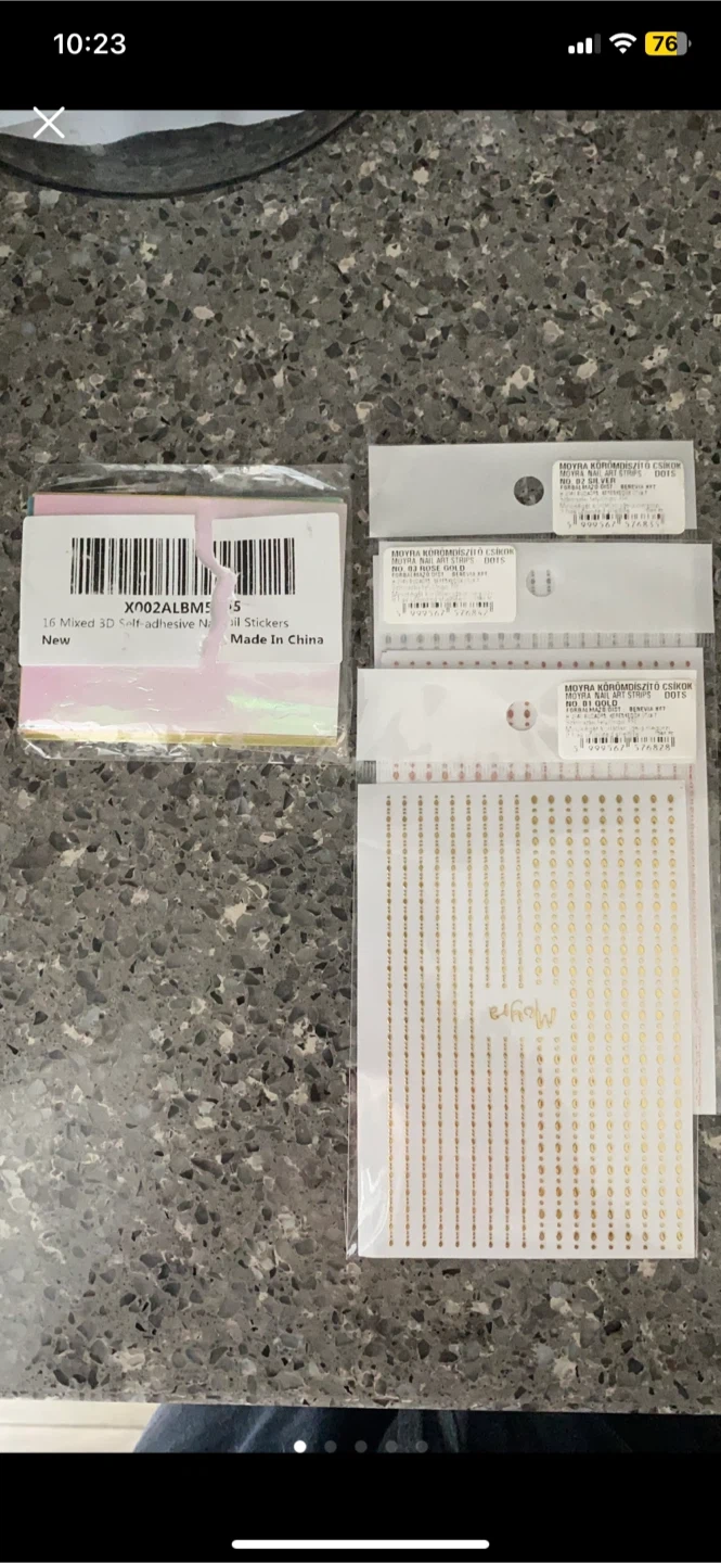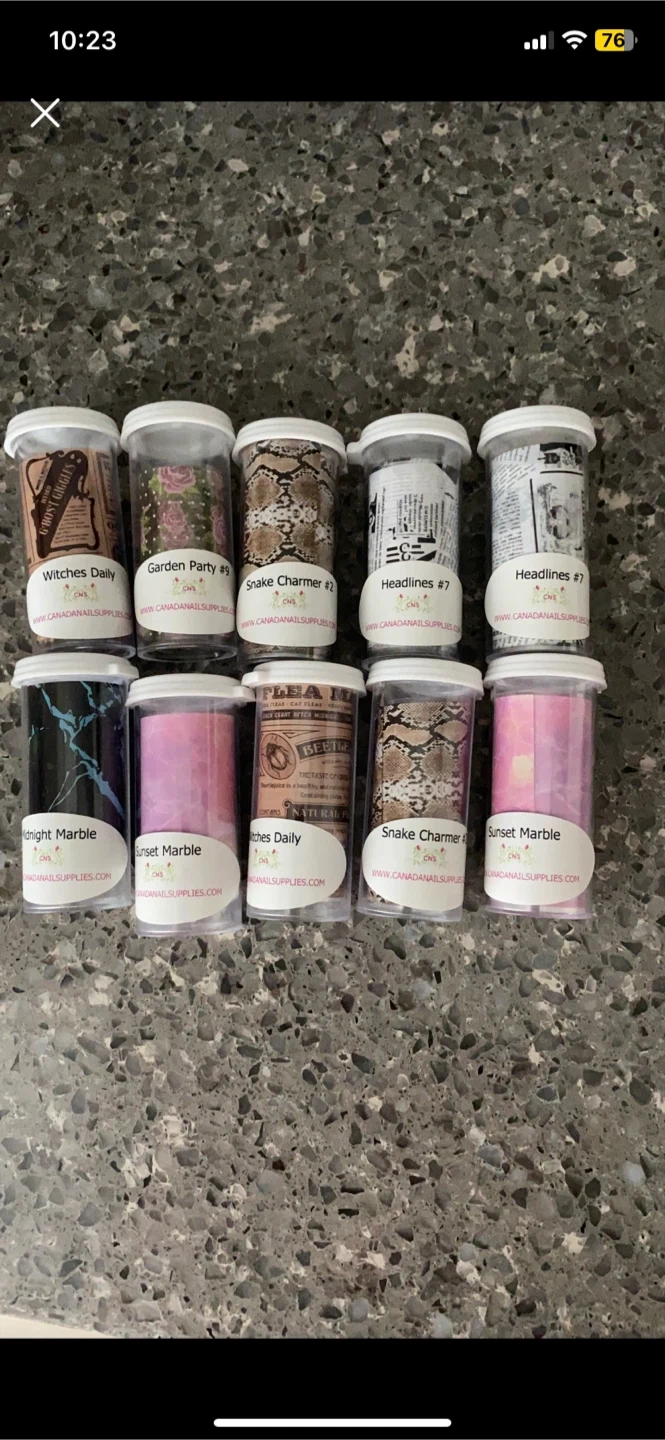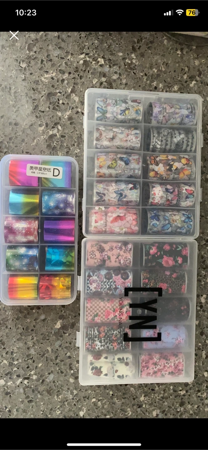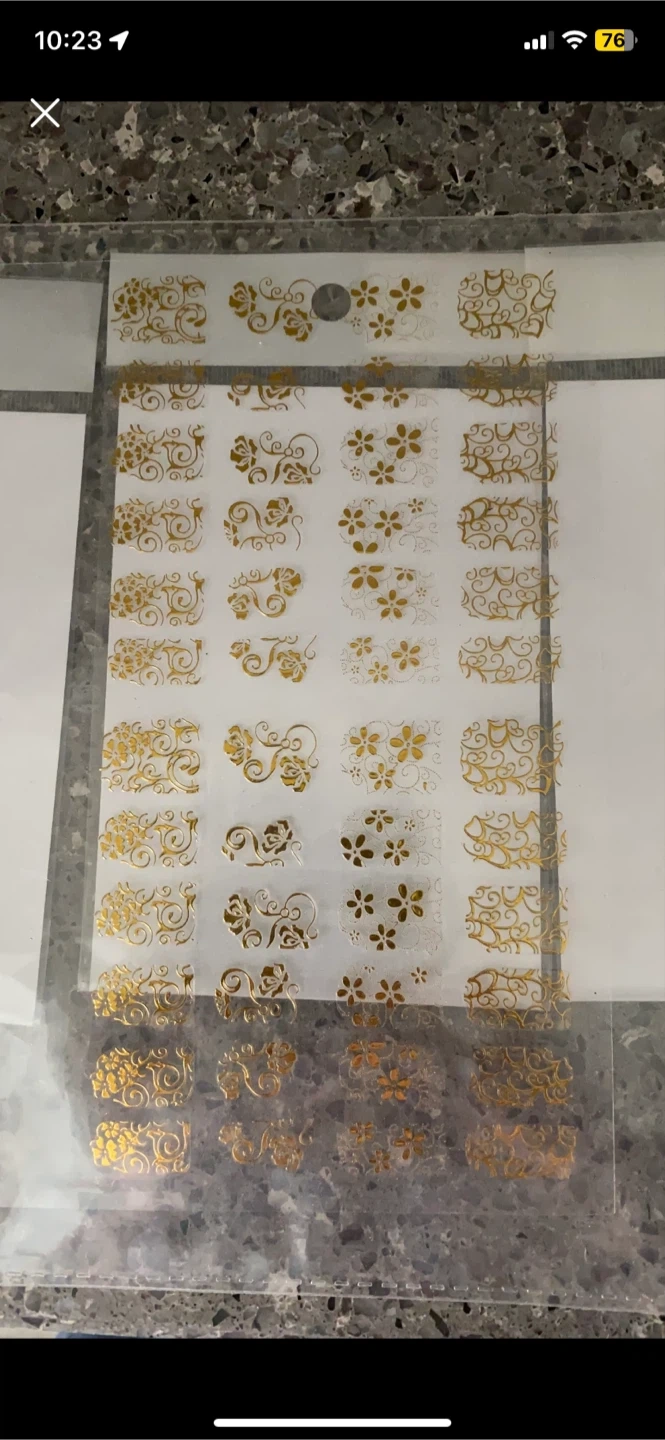 A large collection of nail art stickers, foils, and embellishments in various designs. Includes a variety of patterns like florals, butterflies, marble, and abstract designs. Perfect for creative nail art.