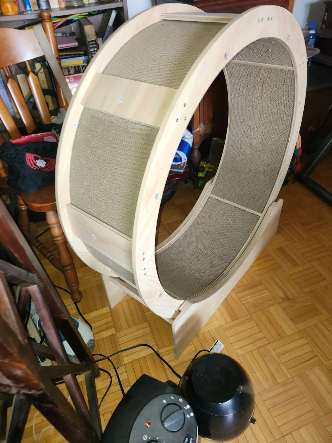 This cat wheel is constructed from light-coloured wood and features sisal rope for scratching. It's designed to provide exercise and entertainment for your feline friends. The wheel's surface is a durable sisal material. For LARGE cat. Biggest wheel I could find only for my cat to not want it.🤦♂️