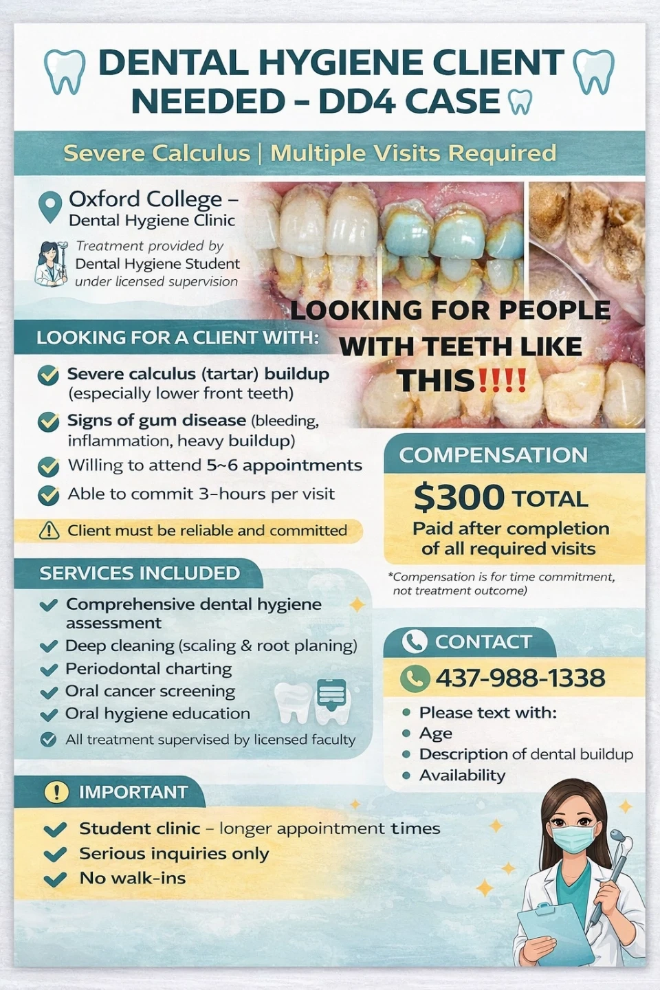 Im a dental hygiene student .Im looking for clients with severe calculus buildup (tartar) and signs of gum disease. Treatment is provided by dental hygiene students under licensed supervision, with services including comprehensive assessment, deep cleaning, scaling, root planing, oral cancer screening, and oral hygiene education. Compensation is $300 total, paid after completion of all required visits. Please text 437-988-1338 with your age, a description of your dental buildup, and availability.