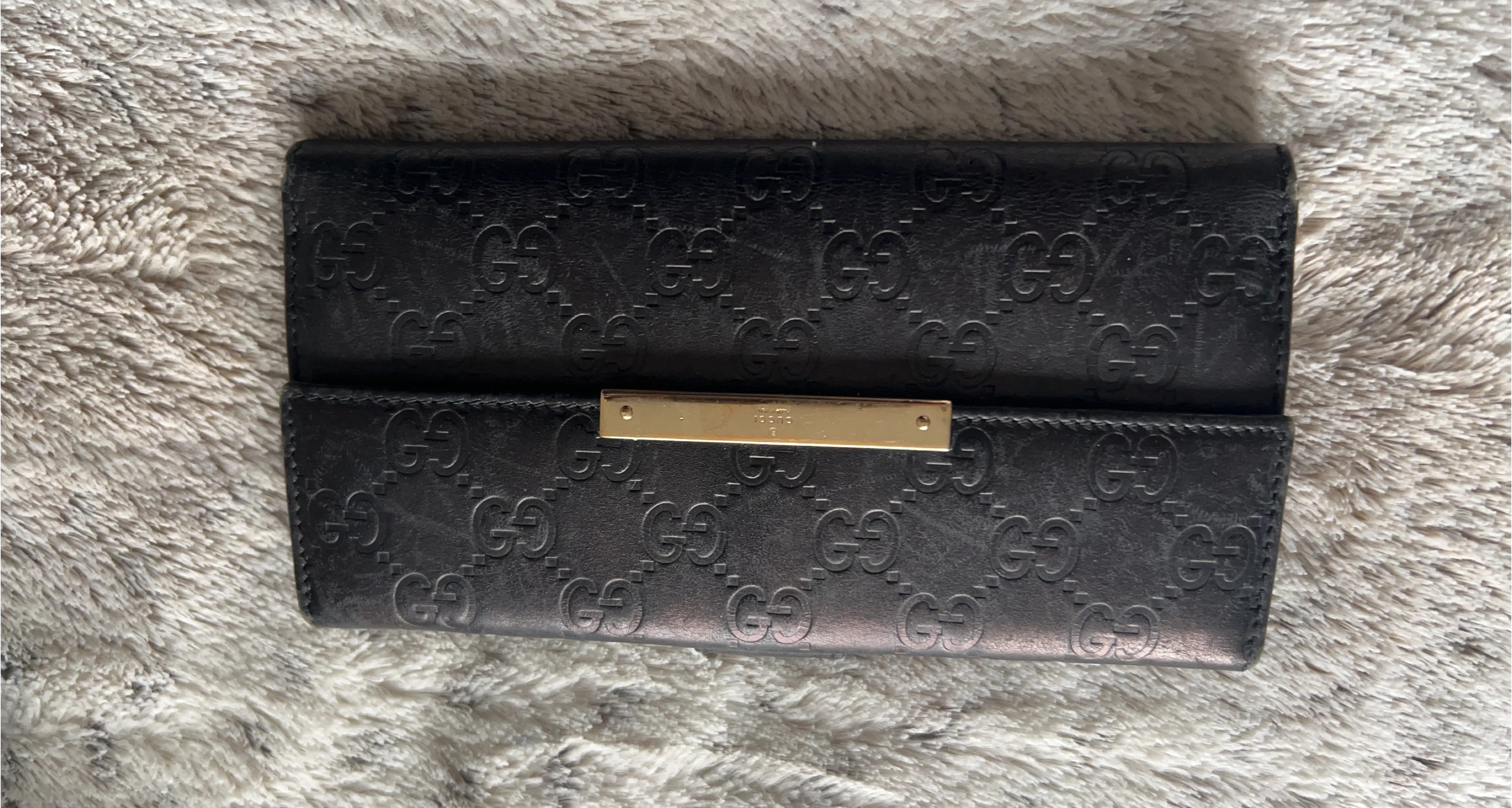 A black leather Gucci long wallet with GG embossing. Features a gold-tone hardware accent and a flap closure. Interior has multiple card slots and compartments.