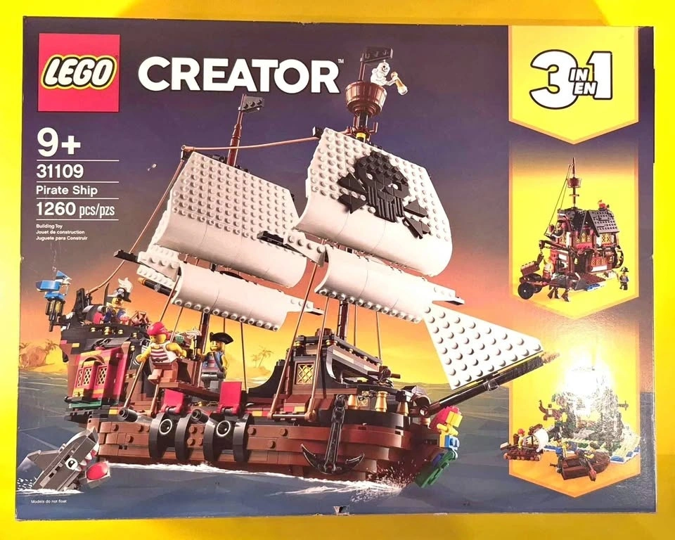 Some damages to box, please see photos! This LEGO Creator 31109 Pirate Ship set features a colorful, buildable pirate ship with sails, a crow’s nest, cannons, and treasure chest. It includes minifigures of pirates and accessories for imaginative sea adventures. The set can also be rebuilt into alternate designs, allowing for creative play and display.