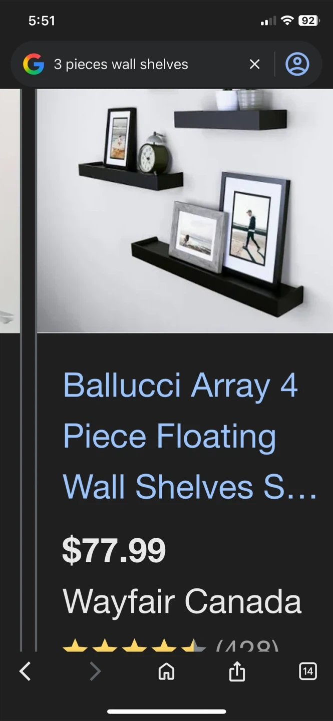 Buy & SellBallucci Array 3 Piece Floating Wall ShelvesBallucci Array 3 Piece Floating Wall Shelves$10Black floating wall shelves. Includes mounting hardware. Adds stylish storage to any room.ConditionNewWHERE TO MEETMeet nearbyView MapSELLERJanoW Hill77154 reviews0 chats·0 favorites·5 viewsSEND CHAT TO SELLERHi Jano! I’m interested in your listing.Hi Jano! I’m interested in your listing.Get the Karrot app to chatSign In to chat