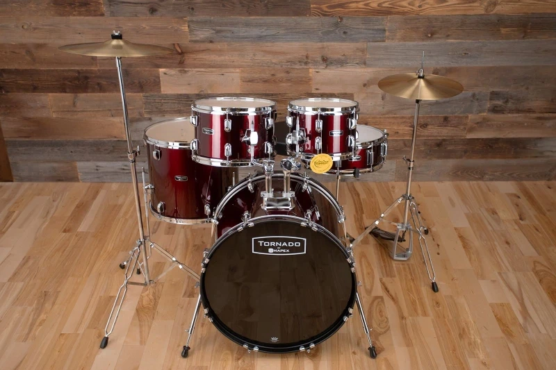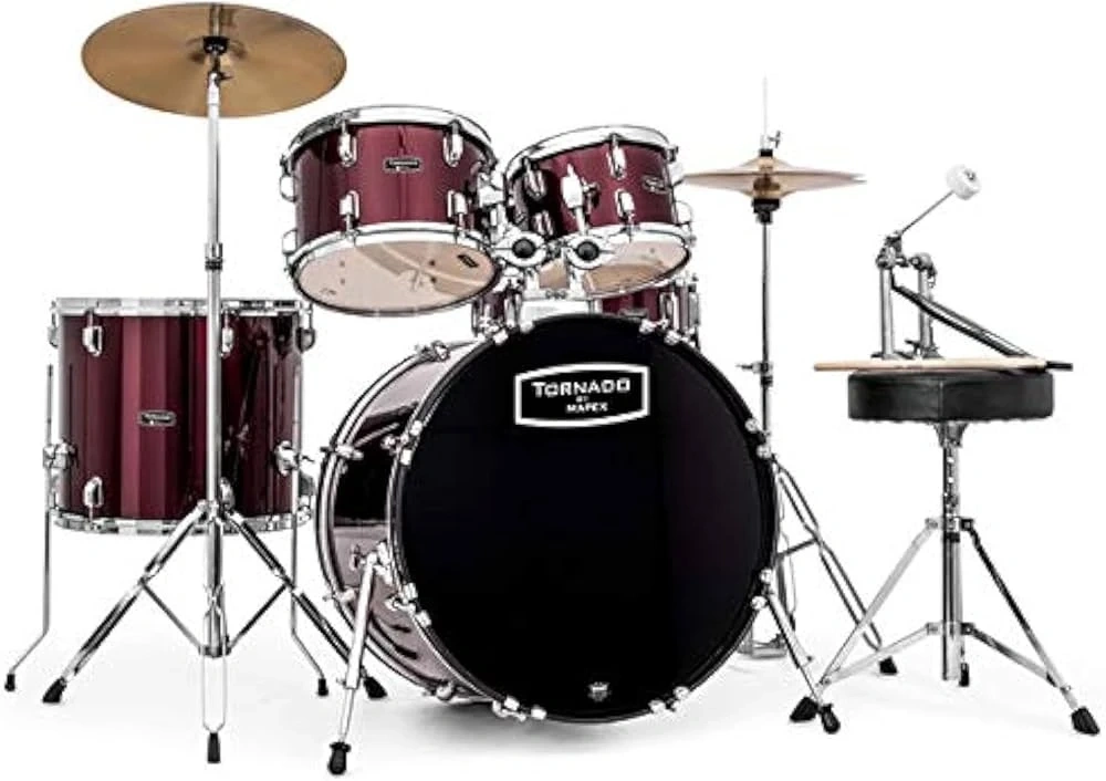 This is a Mapex Tornado drum kit in a deep red finish. It includes a bass drum, snare drum, two mounted toms, and a floor tom. Two cymbals and stands are also included, along with a bass drum pedal and drum stool. Perfect for beginner drummers!