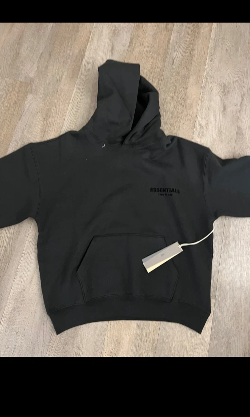 This is an ESSENTIALS Fear of God black hoodie. It's a pullover style with a front pouch pocket and a drawstring hood. Made from soft, comfortable material.