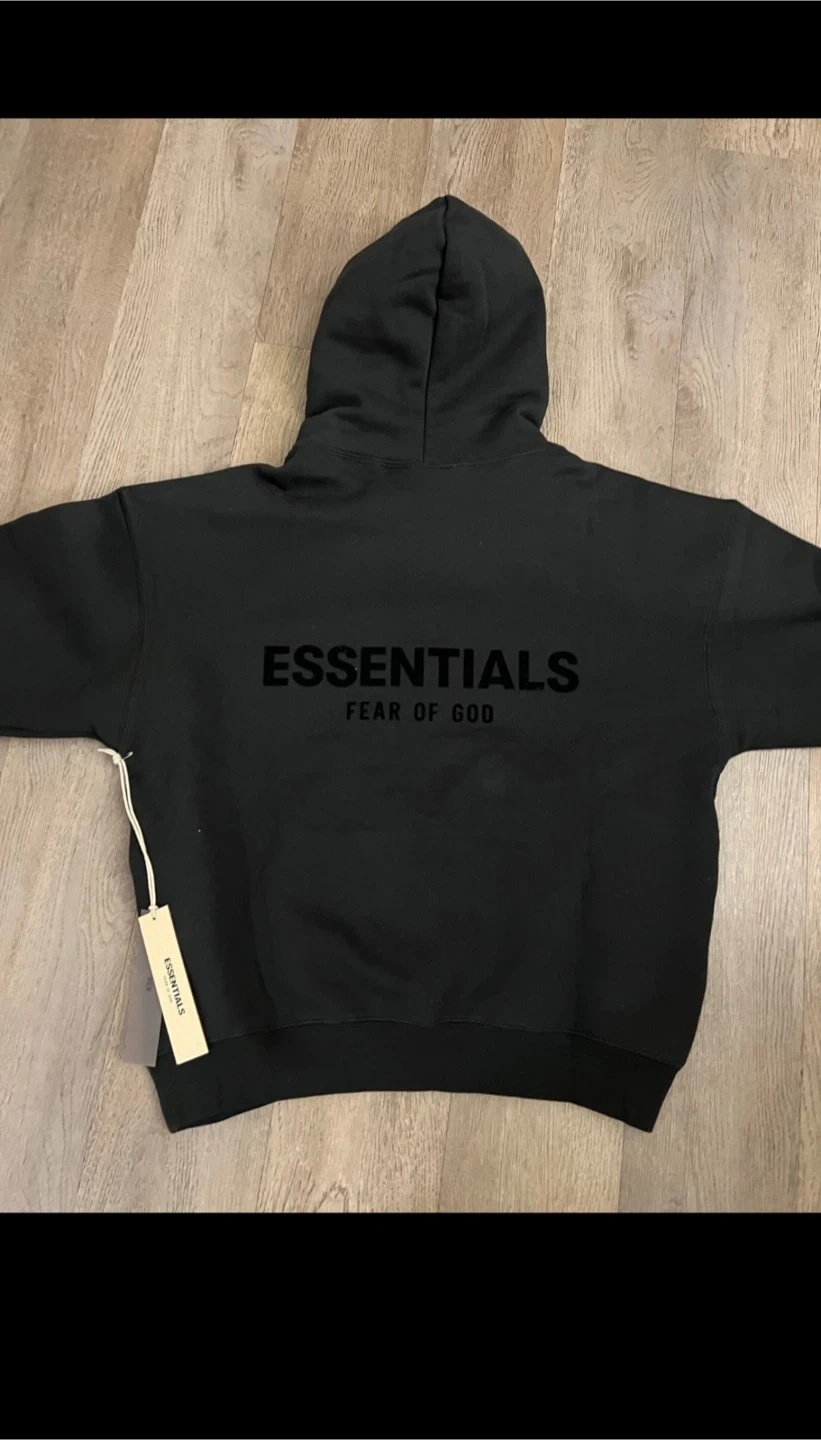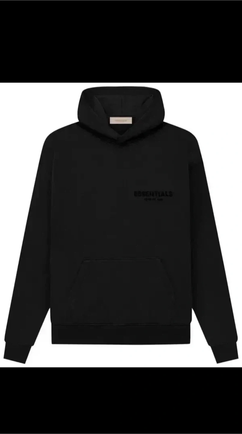 This is an ESSENTIALS Fear of God black hoodie. It's a pullover style with a front pouch pocket and a drawstring hood. Made from soft, comfortable material.