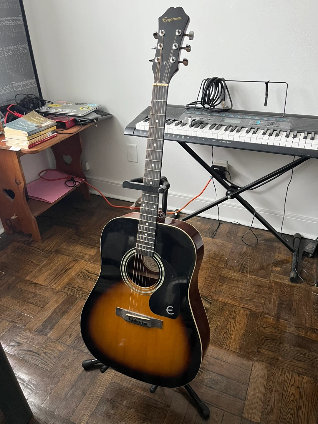 This is an Epiphone DR 100 acoustic guitar. It comes with a black gig bag for transport and protection. This instrument is great for learning or casual playing. $100 obo
