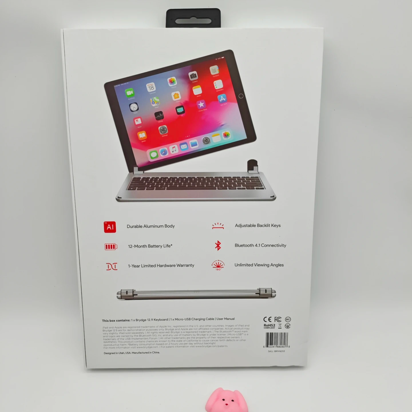 This Brydge wireless keyboard features a durable aluminum body and adjustable backlit keys. It offers 12-month battery life and Bluetooth 4.1 connectivity. Includes 1x Micro-USB charging cable and user manual. Designed in USA, manufactured in China.