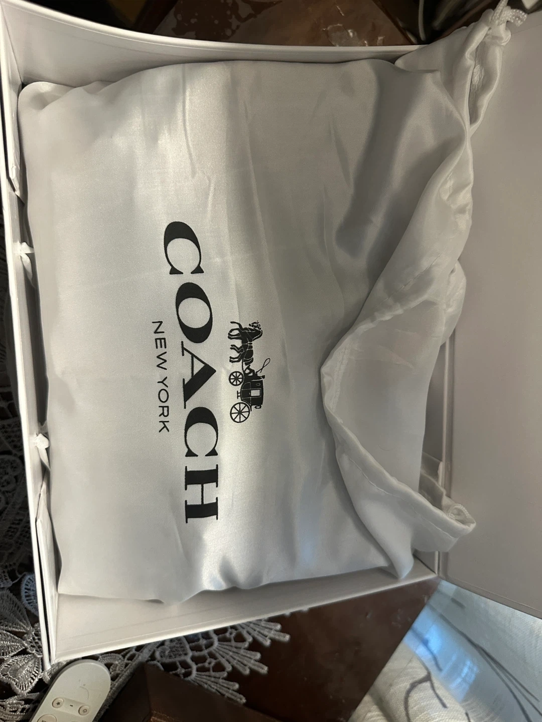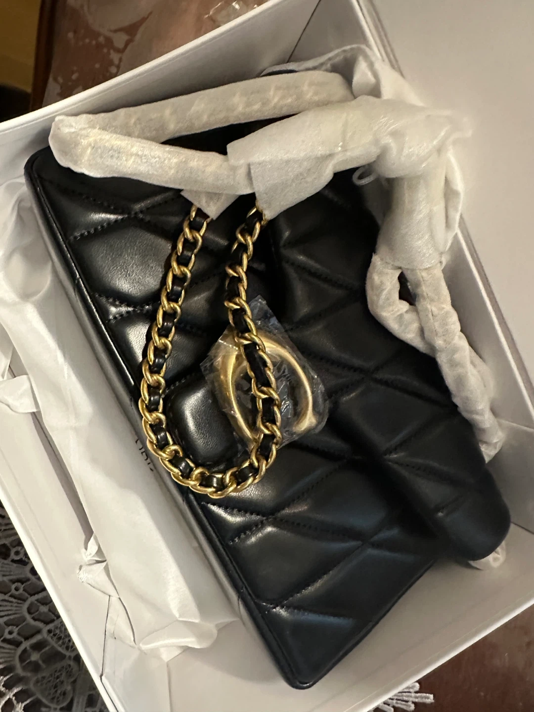 This is a Coach shoulder bag in black quilted leather. It features a gold-tone chain strap and hardware. The bag comes in its original Coach box with a dust bag. It's perfect for a night out or everyday use!