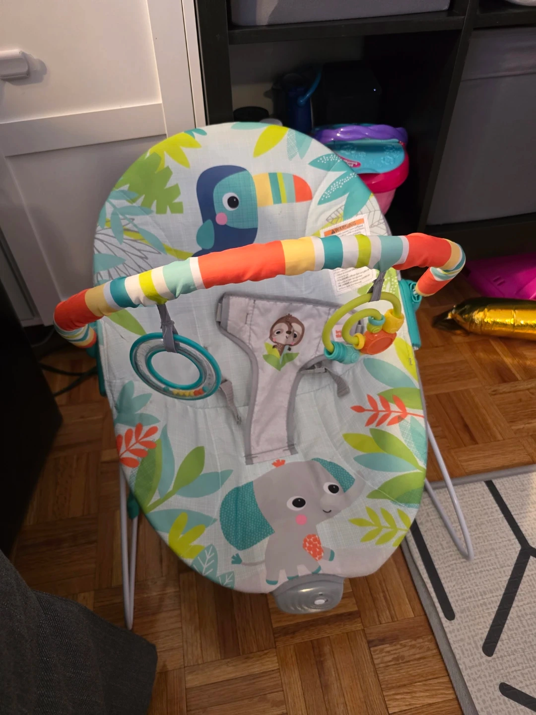 This used Bright Starts baby bouncer features a playful jungle theme with an elephant and toucan. It includes a removable toy bar with rattles for baby's entertainment. Suitable for infants.